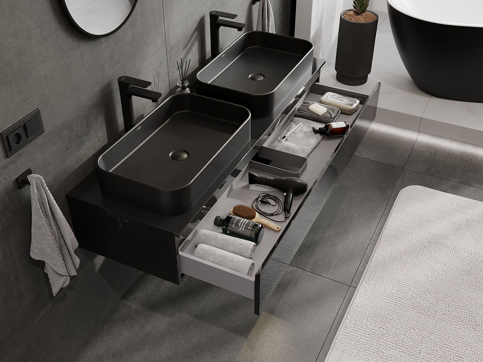 Mexen Orio Badezimmerschrank unter Waschbecken 140 cm, 1 Schublade, schwarz glänzend - 91A10-14023-1-BF70