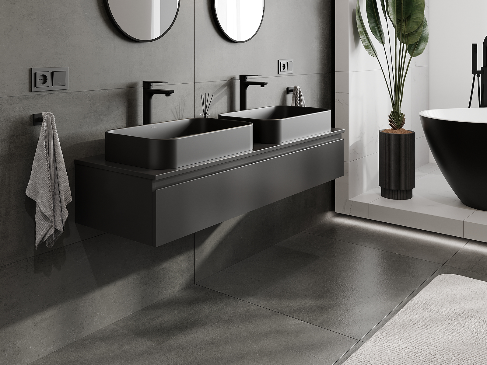 Unsere modularen Badezimmermöbel können in verschiedenen Farbkonfigurationen miteinander kombiniert werden, wodurch eine vollständige Personalisierung ermöglicht wird. Man kann sowohl das Aussehen als auch die Funktionen der einzelnen Elemente auswählen, was es erlaubt, die Möbel an eigene stilistische und funktionale Vorlieben anzupassen.