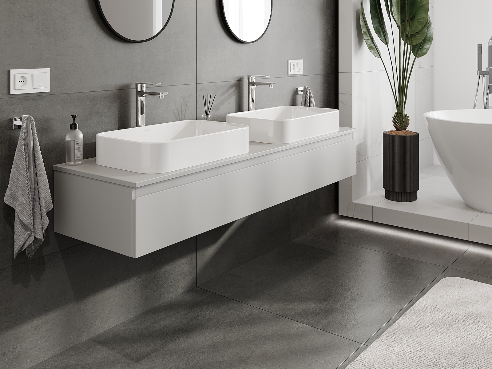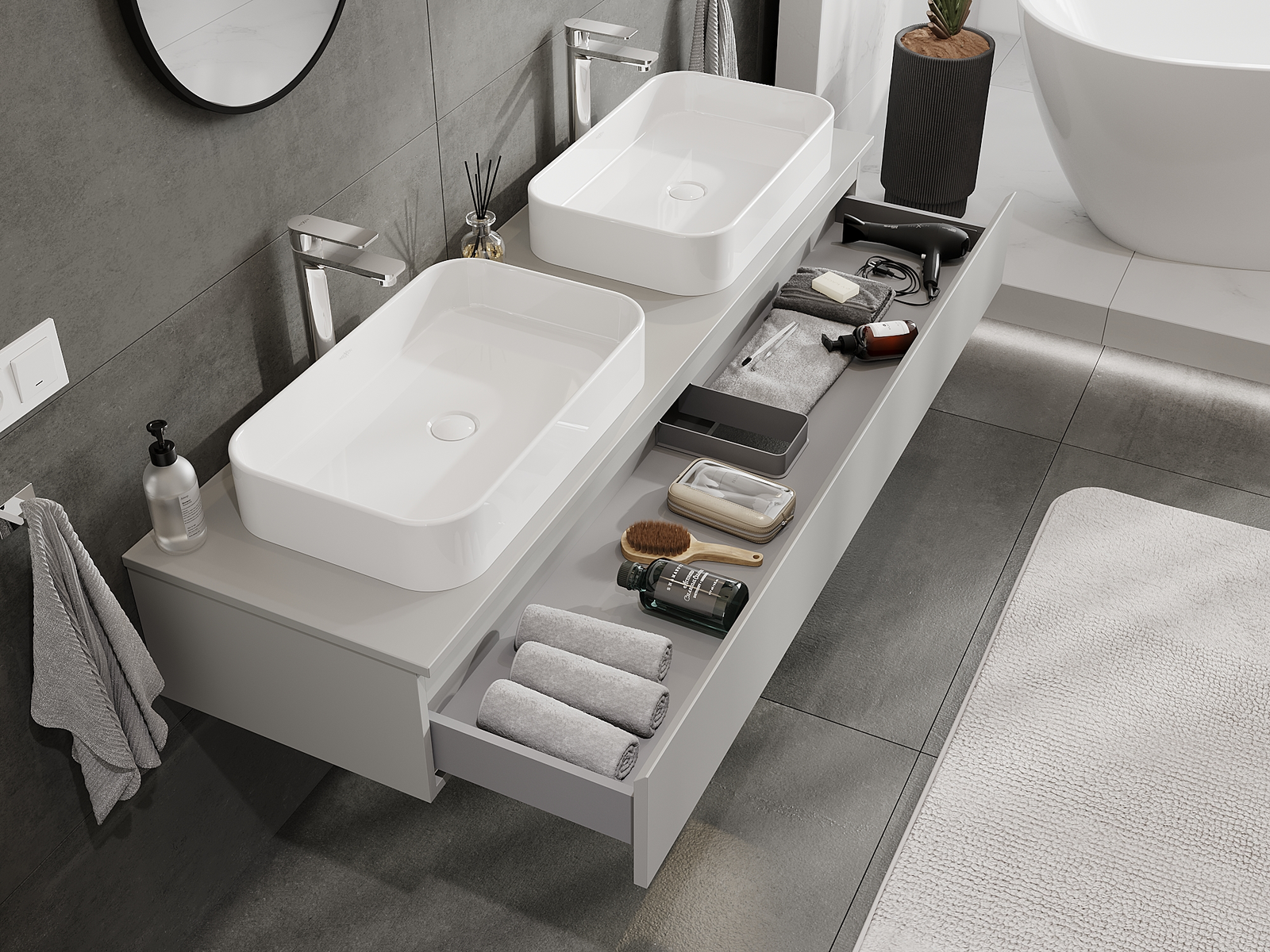 Unsere modularen Badezimmermöbel können in verschiedenen Farbkonfigurationen miteinander kombiniert werden, wodurch eine vollständige Personalisierung ermöglicht wird. Man kann sowohl das Aussehen als auch die Funktionen der einzelnen Elemente auswählen, was es erlaubt, die Möbel an eigene stilistische und funktionale Vorlieben anzupassen.