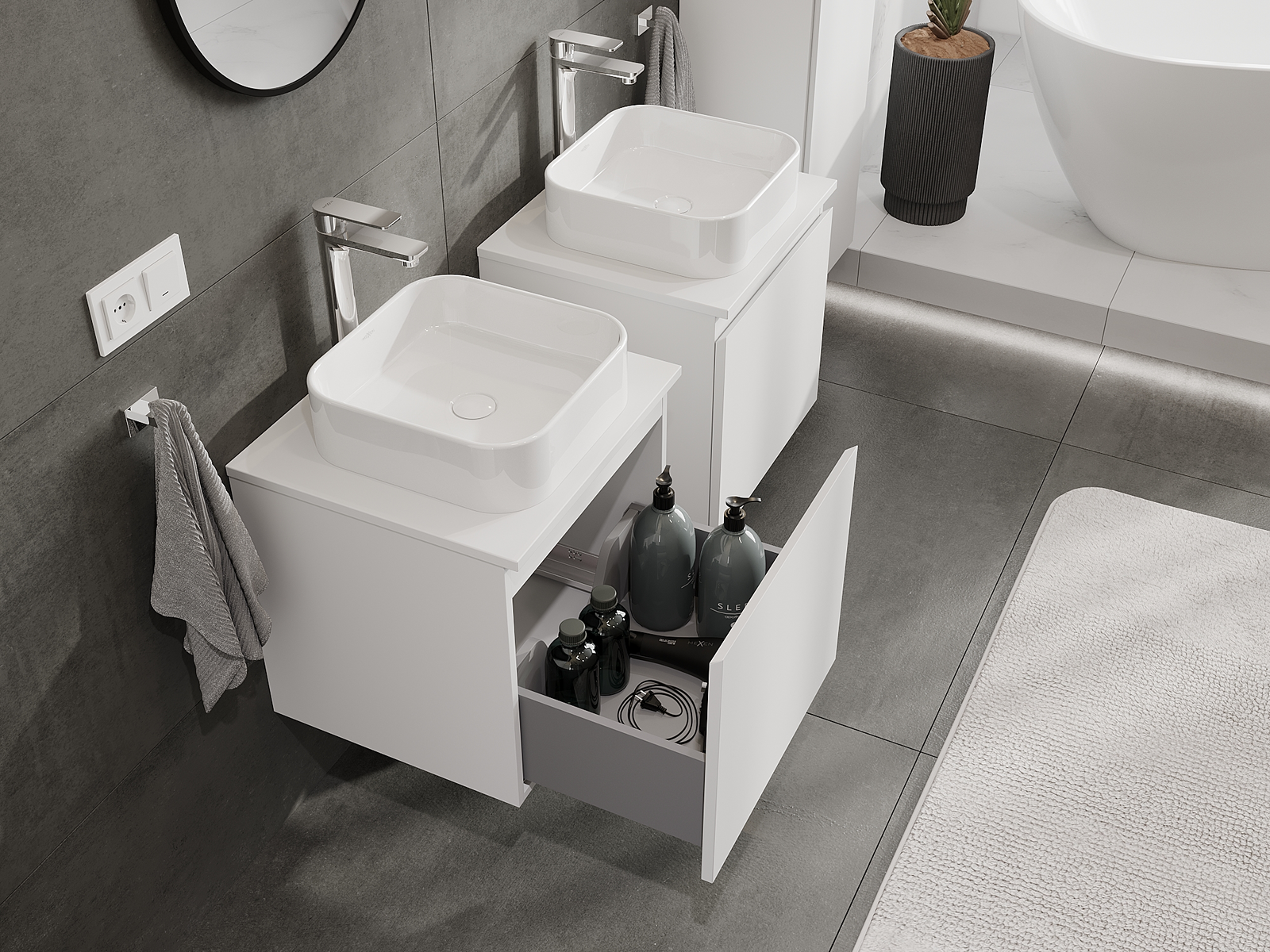 Unsere modularen Badezimmermöbel können in verschiedenen Farbkonfigurationen miteinander kombiniert werden, wodurch eine vollständige Personalisierung ermöglicht wird. Man kann sowohl das Aussehen als auch die Funktionen der einzelnen Elemente auswählen, was es erlaubt, die Möbel an eigene stilistische und funktionale Vorlieben anzupassen.