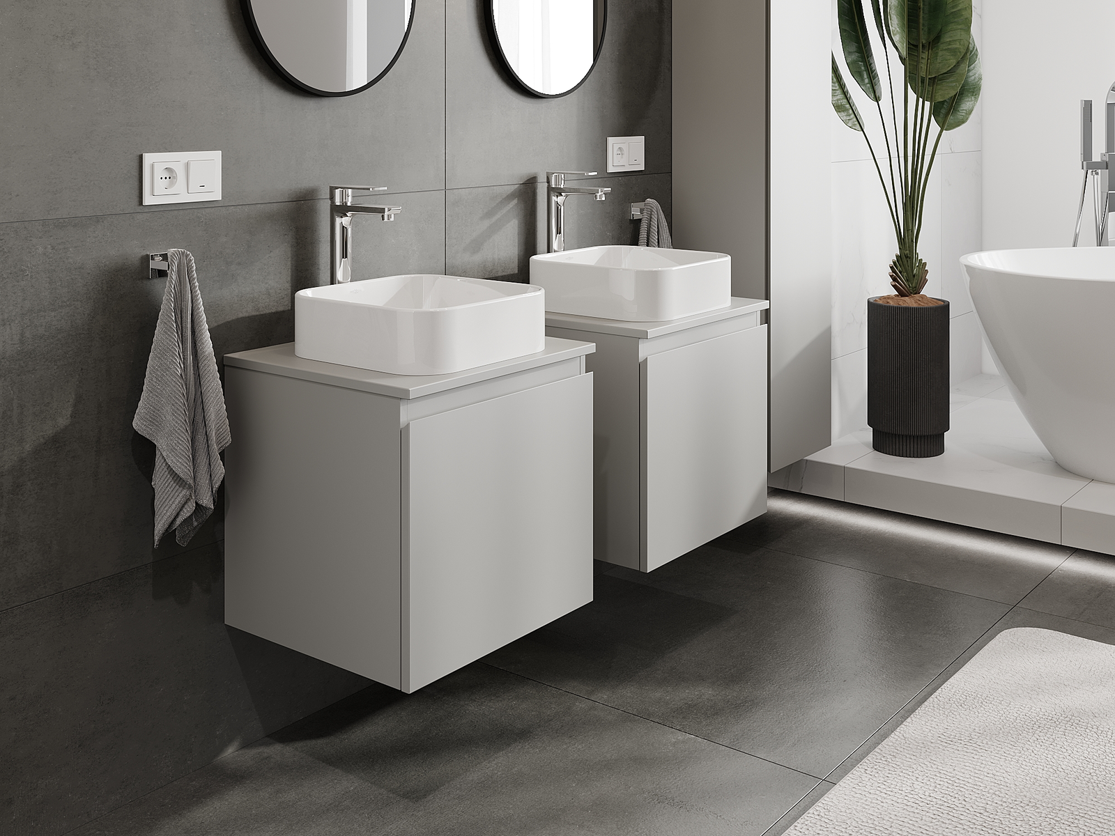 Unsere modularen Badezimmermöbel können in verschiedenen Farbkonfigurationen miteinander kombiniert werden, wodurch eine vollständige Personalisierung ermöglicht wird. Man kann sowohl das Aussehen als auch die Funktionen der einzelnen Elemente auswählen, was es erlaubt, die Möbel an eigene stilistische und funktionale Vorlieben anzupassen.