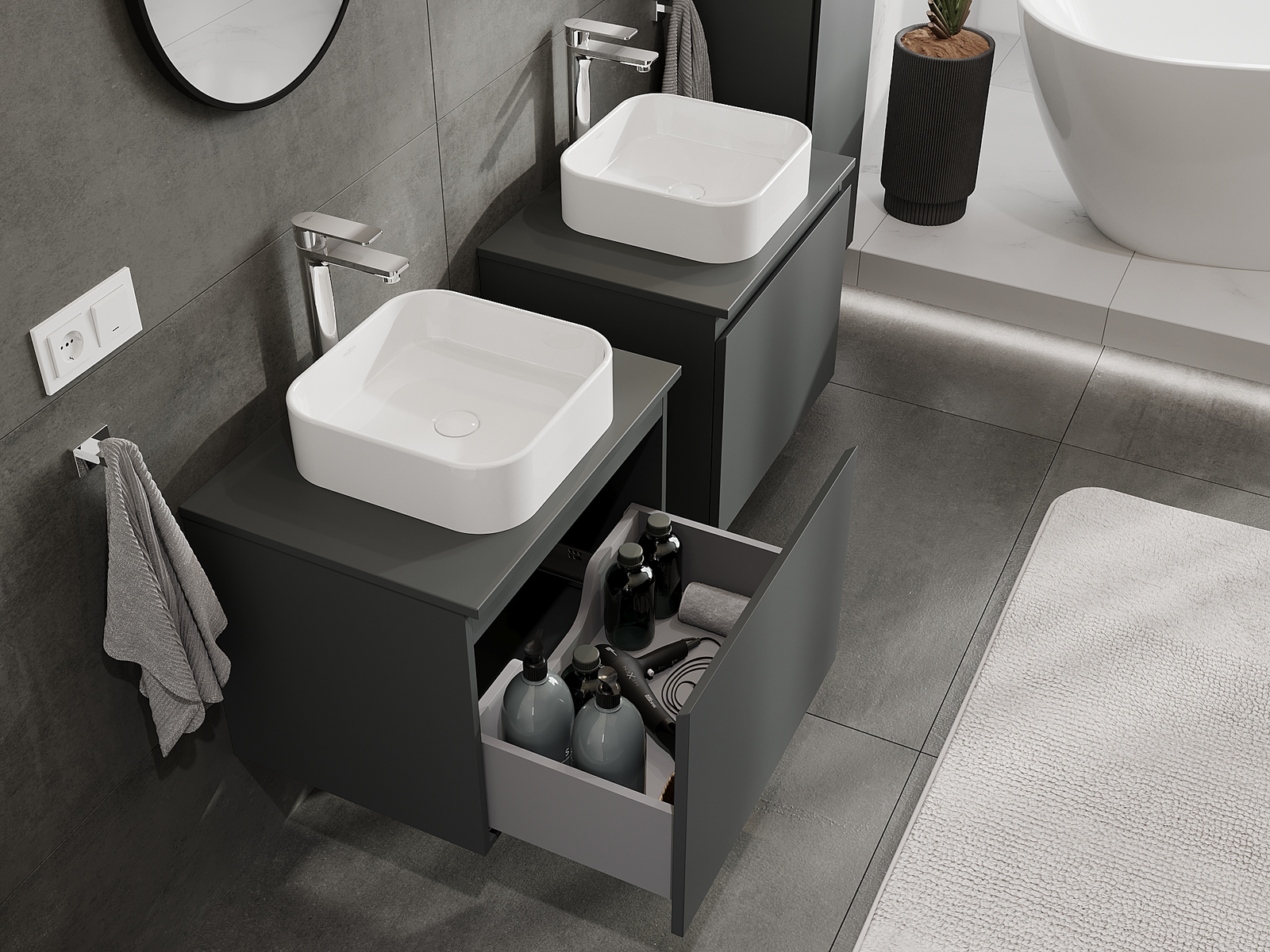 Unsere modularen Badezimmermöbel können in verschiedenen Farbkonfigurationen miteinander kombiniert werden, wodurch eine vollständige Personalisierung ermöglicht wird. Man kann sowohl das Aussehen als auch die Funktionen der einzelnen Elemente auswählen, was es erlaubt, die Möbel an eigene stilistische und funktionale Vorlieben anzupassen.