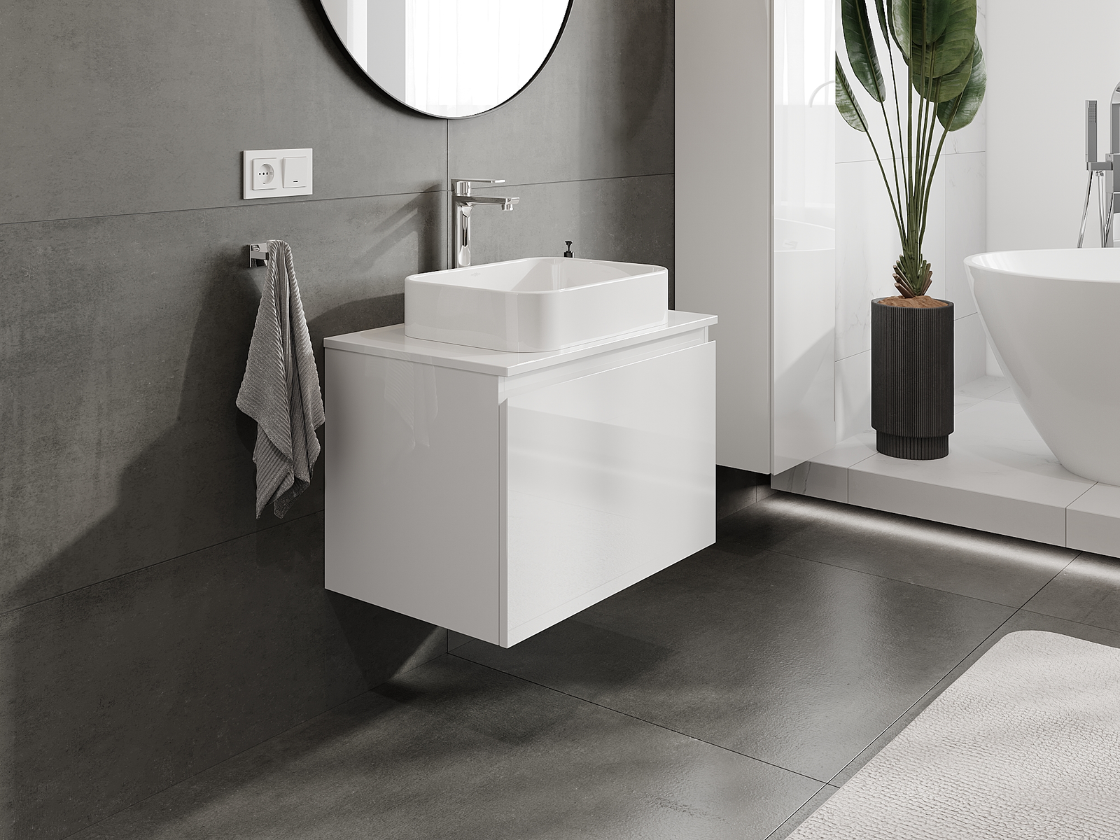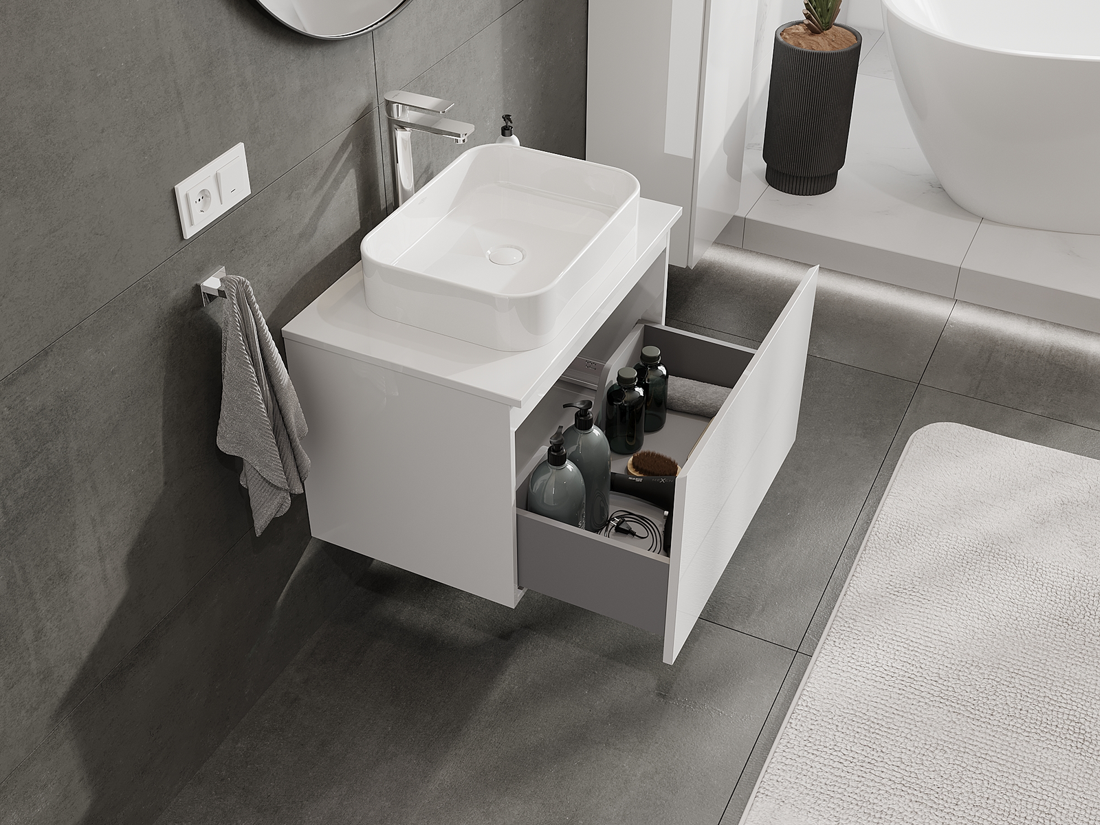 Unsere modularen Badezimmermöbel können in verschiedenen Farbkonfigurationen miteinander kombiniert werden, wodurch eine vollständige Personalisierung ermöglicht wird. Man kann sowohl das Aussehen als auch die Funktionen der einzelnen Elemente auswählen, was es erlaubt, die Möbel an eigene stilistische und funktionale Vorlieben anzupassen.