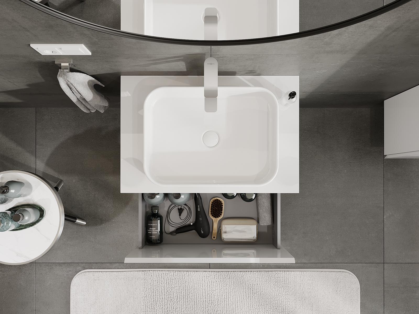 Der Ausschnitt in der Schublade ist so gestaltet, dass er den Siphon aufnehmen kann, der für Waschbeckeninstallationen erforderlich ist. Dadurch kann das Möbelstück voll funktionsfähig montiert werden, ohne auf den Platz in der Schublade zugunsten der Installation verzichten zu müssen.