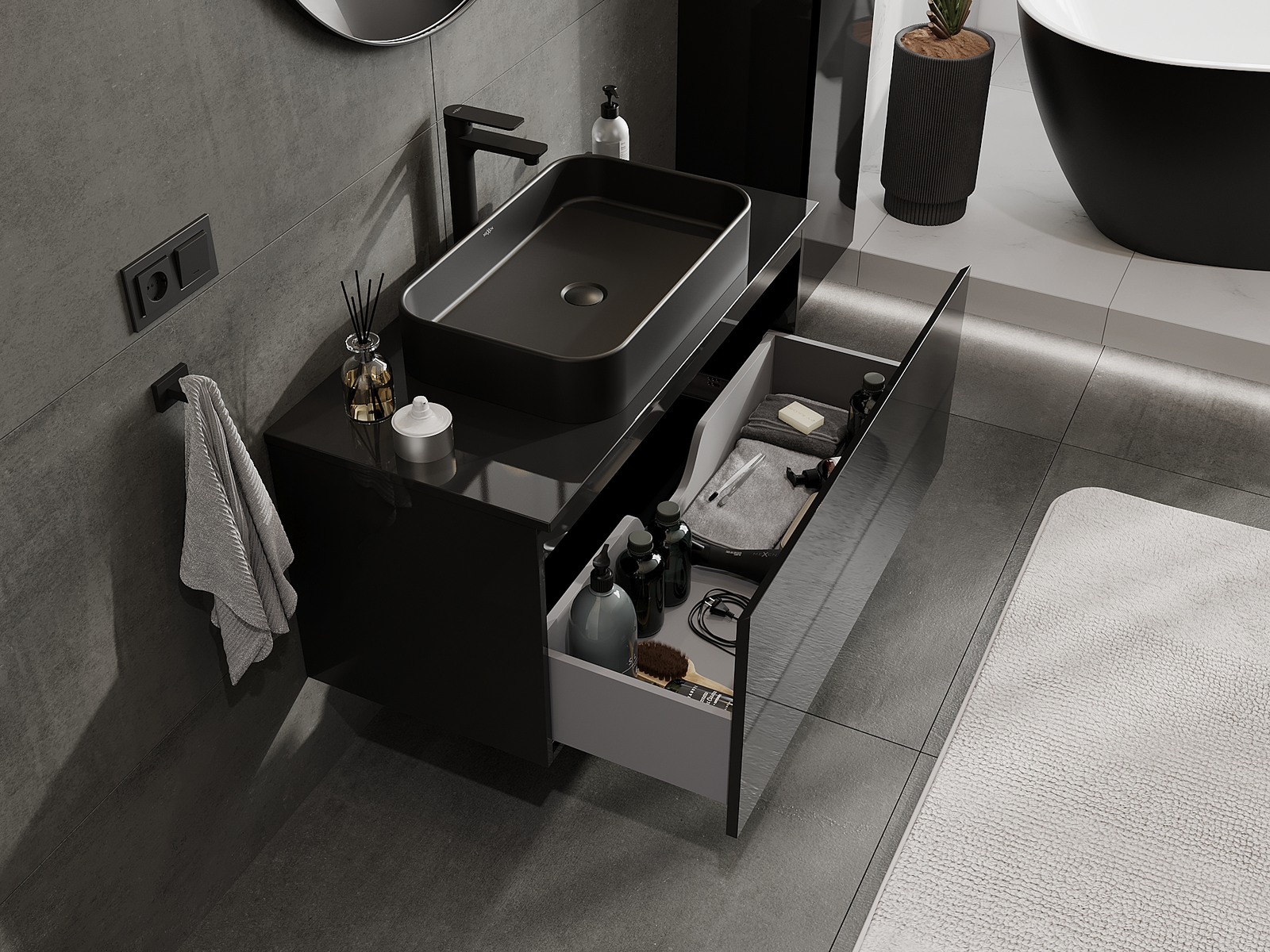 Mexen Orio Badezimmerschrank für Waschbecken 100 cm, 1 Schublade, Schwarz Hochglanz - 91A10-10047-1-BF70