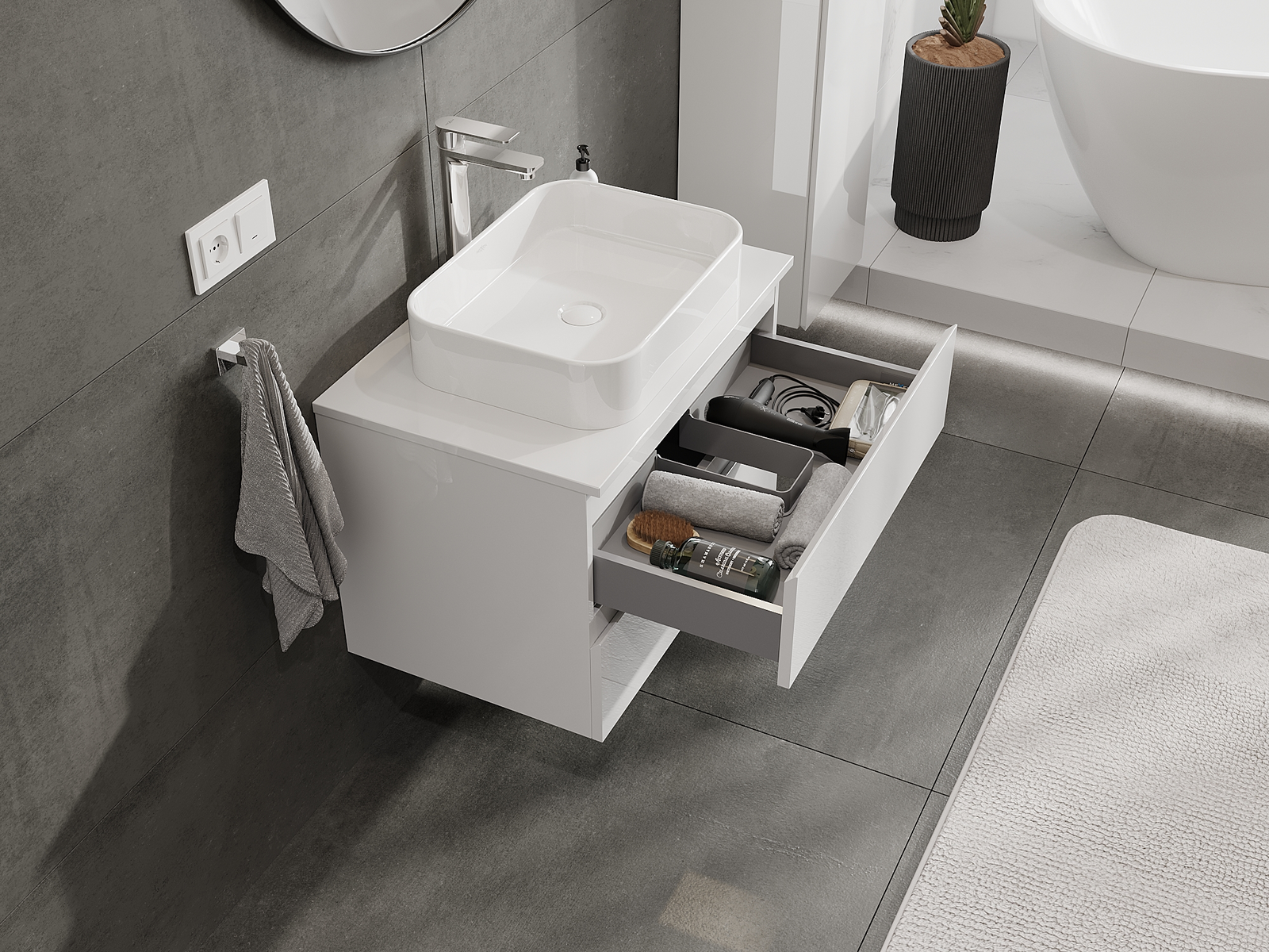 Unsere modularen Badezimmermöbel können in verschiedenen Farbkonfigurationen miteinander kombiniert werden, wodurch eine vollständige Personalisierung ermöglicht wird. Man kann sowohl das Aussehen als auch die Funktionen der einzelnen Elemente auswählen, was es erlaubt, die Möbel an eigene stilistische und funktionale Vorlieben anzupassen.