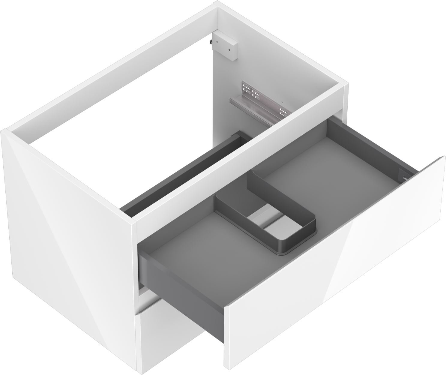 Der Ausschnitt in der Schublade ist für die Aufnahme eines Siphons ausgelegt, der für die Installation von Waschbecken unerlässlich ist. Dadurch kann das Möbelstück voll funktionsfähig installiert werden, ohne dass für die Installation Schubladenplatz geopfert werden muss.