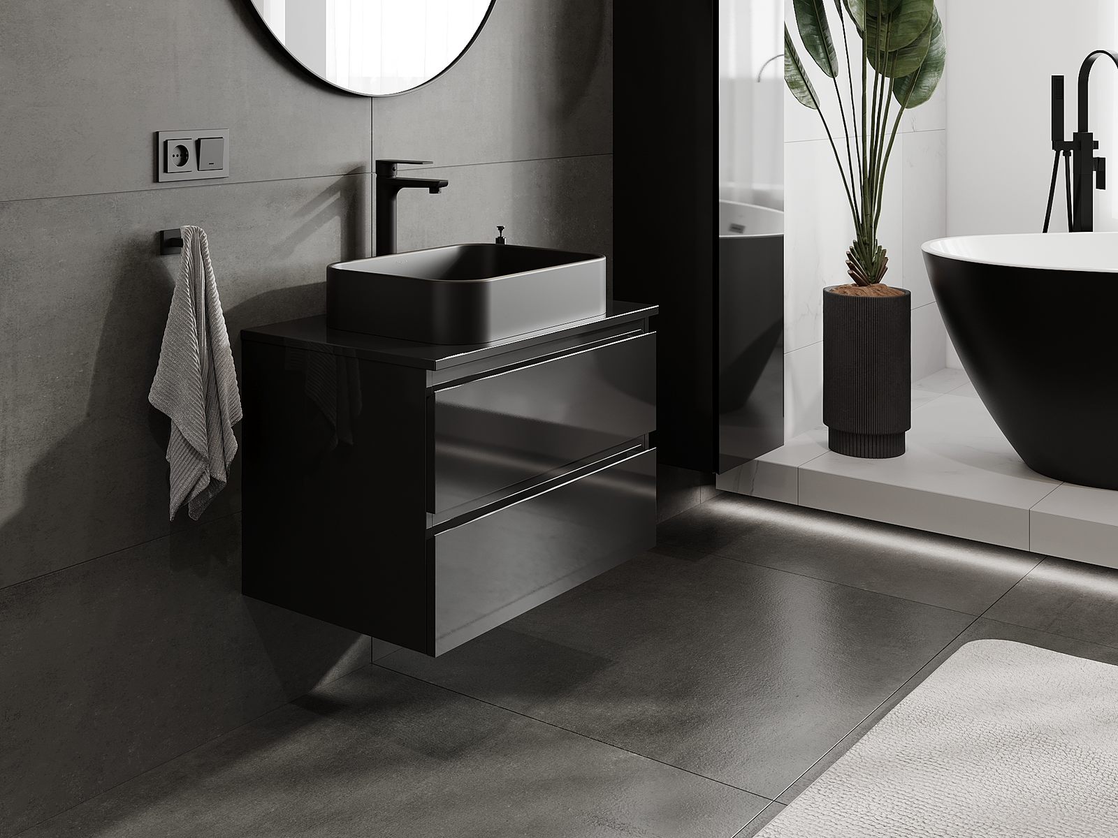 Unsere modularen Badezimmermöbel können in verschiedenen Farbkonfigurationen miteinander kombiniert werden, wodurch eine vollständige Personalisierung ermöglicht wird. Man kann sowohl das Aussehen als auch die Funktionen der einzelnen Elemente auswählen, was es erlaubt, die Möbel an eigene stilistische und funktionale Vorlieben anzupassen.