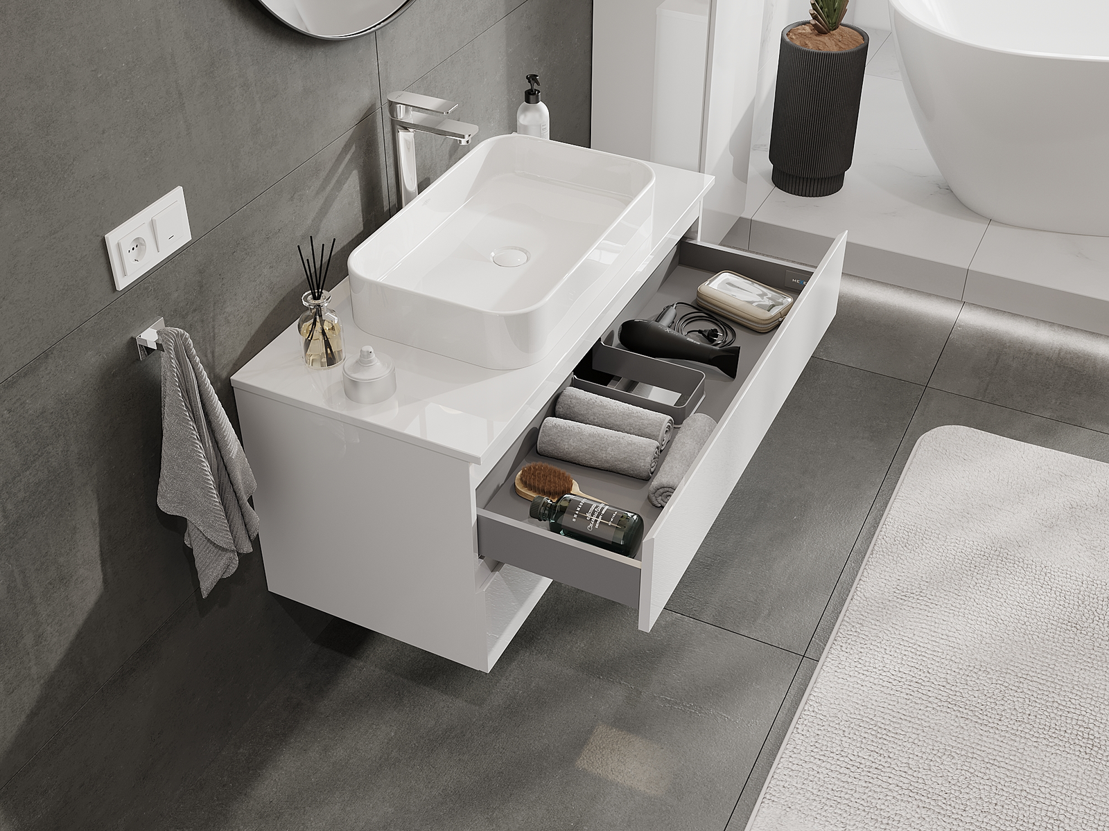 Unsere modularen Badezimmermöbel können in verschiedenen Farbkonfigurationen miteinander kombiniert werden, wodurch eine vollständige Personalisierung ermöglicht wird. Man kann sowohl das Aussehen als auch die Funktionen der einzelnen Elemente auswählen, was es erlaubt, die Möbel an eigene stilistische und funktionale Vorlieben anzupassen.