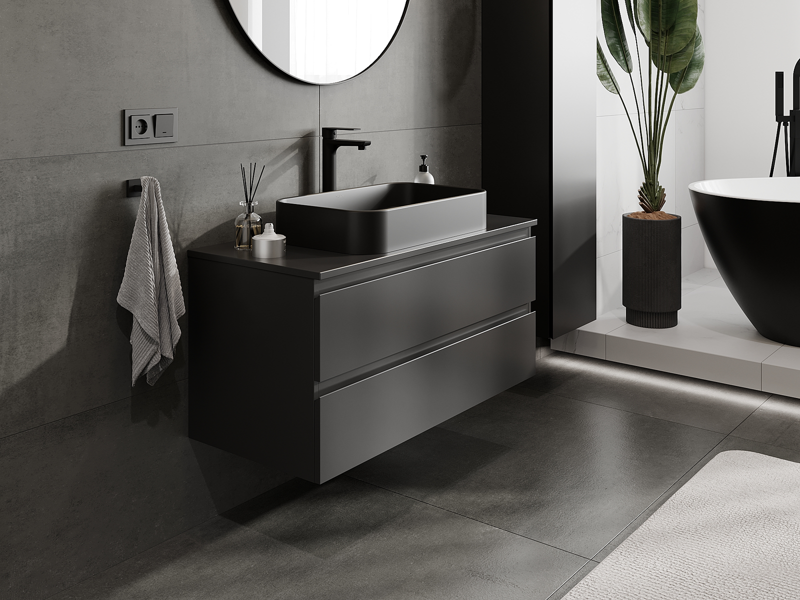 Unsere modularen Badezimmermöbel können in verschiedenen Farbkonfigurationen miteinander kombiniert werden, wodurch eine vollständige Personalisierung ermöglicht wird. Man kann sowohl das Aussehen als auch die Funktionen der einzelnen Elemente auswählen, was es erlaubt, die Möbel an eigene stilistische und funktionale Vorlieben anzupassen.