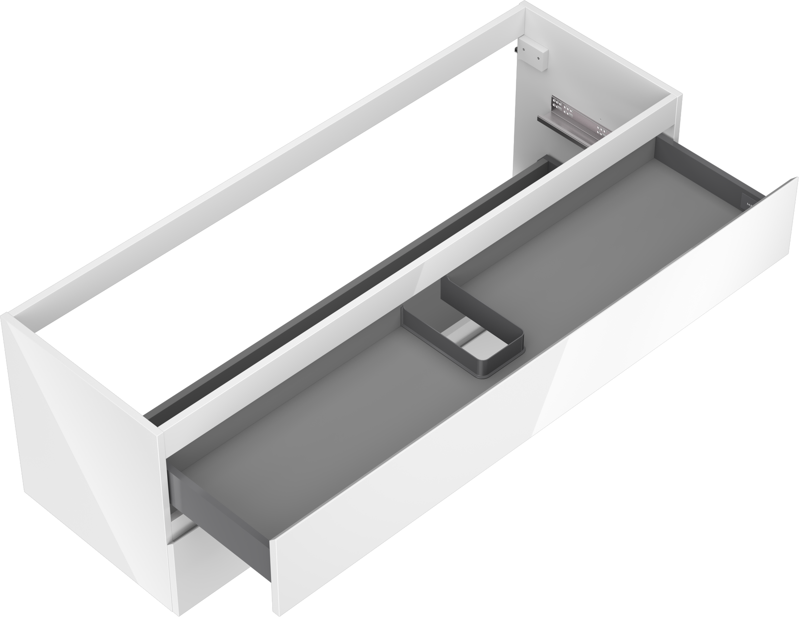 Der Ausschnitt in der Schublade ist so gestaltet, dass er den Siphon aufnehmen kann, der für Waschbeckeninstallationen erforderlich ist. Dadurch kann das Möbelstück voll funktionsfähig montiert werden, ohne auf den Platz in der Schublade zugunsten der Installation verzichten zu müssen.