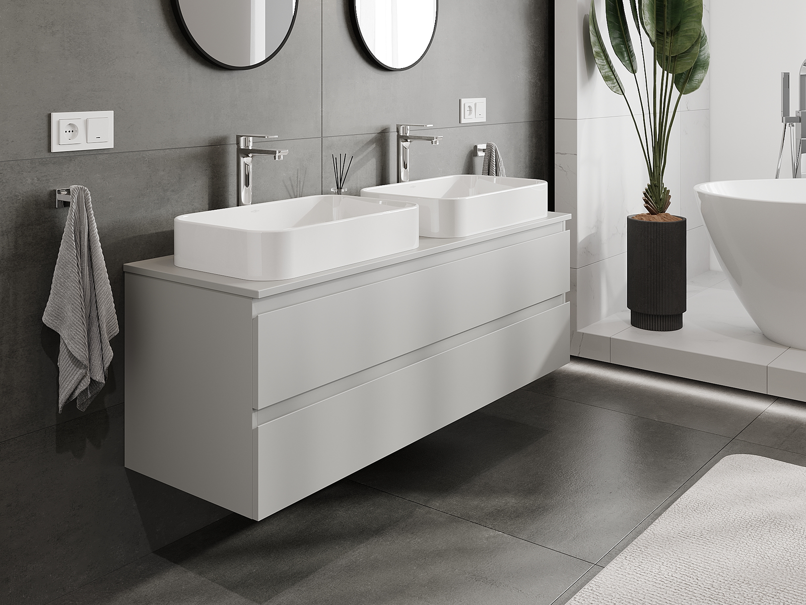 Unsere modularen Badezimmermöbel können in verschiedenen Farbkonfigurationen miteinander kombiniert werden, wodurch eine vollständige Personalisierung ermöglicht wird. Man kann sowohl das Aussehen als auch die Funktionen der einzelnen Elemente auswählen, was es erlaubt, die Möbel an eigene stilistische und funktionale Vorlieben anzupassen.