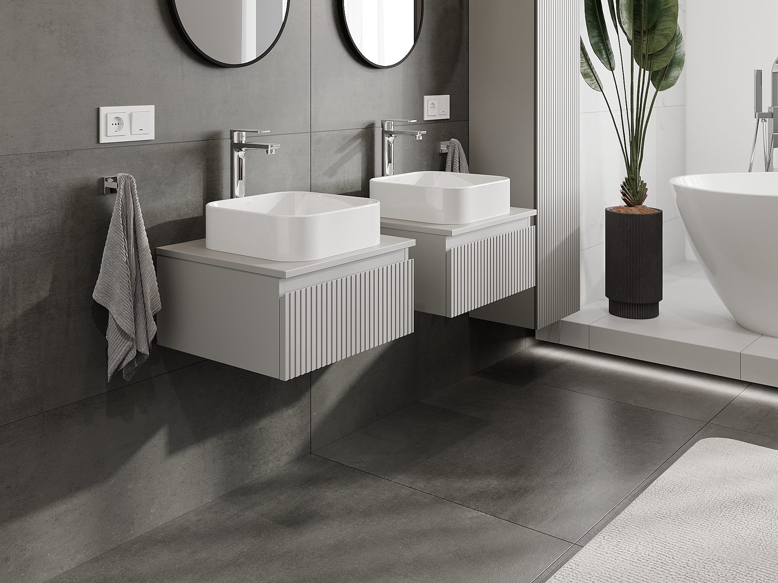 Unsere modularen Badezimmermöbel können in verschiedenen Farbkonfigurationen miteinander kombiniert werden, wodurch eine vollständige Personalisierung ermöglicht wird. Man kann sowohl das Aussehen als auch die Funktionen der einzelnen Elemente auswählen, was es erlaubt, die Möbel an eigene stilistische und funktionale Vorlieben anzupassen.