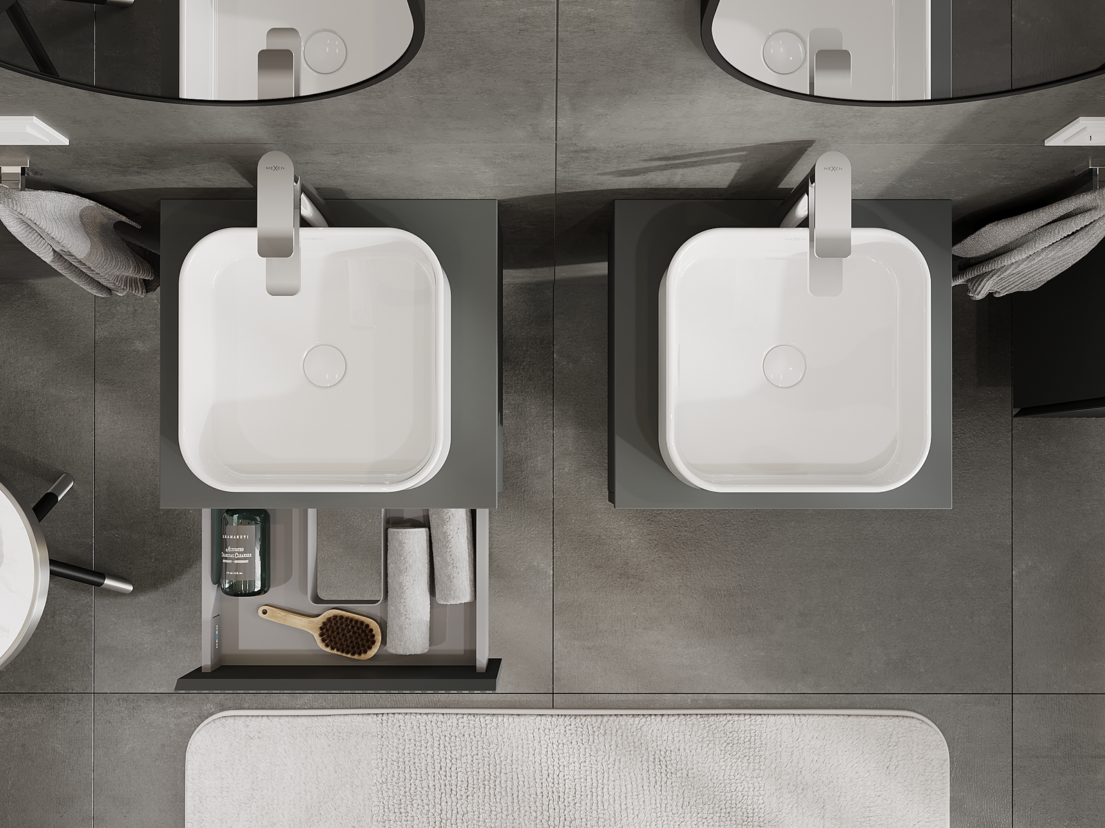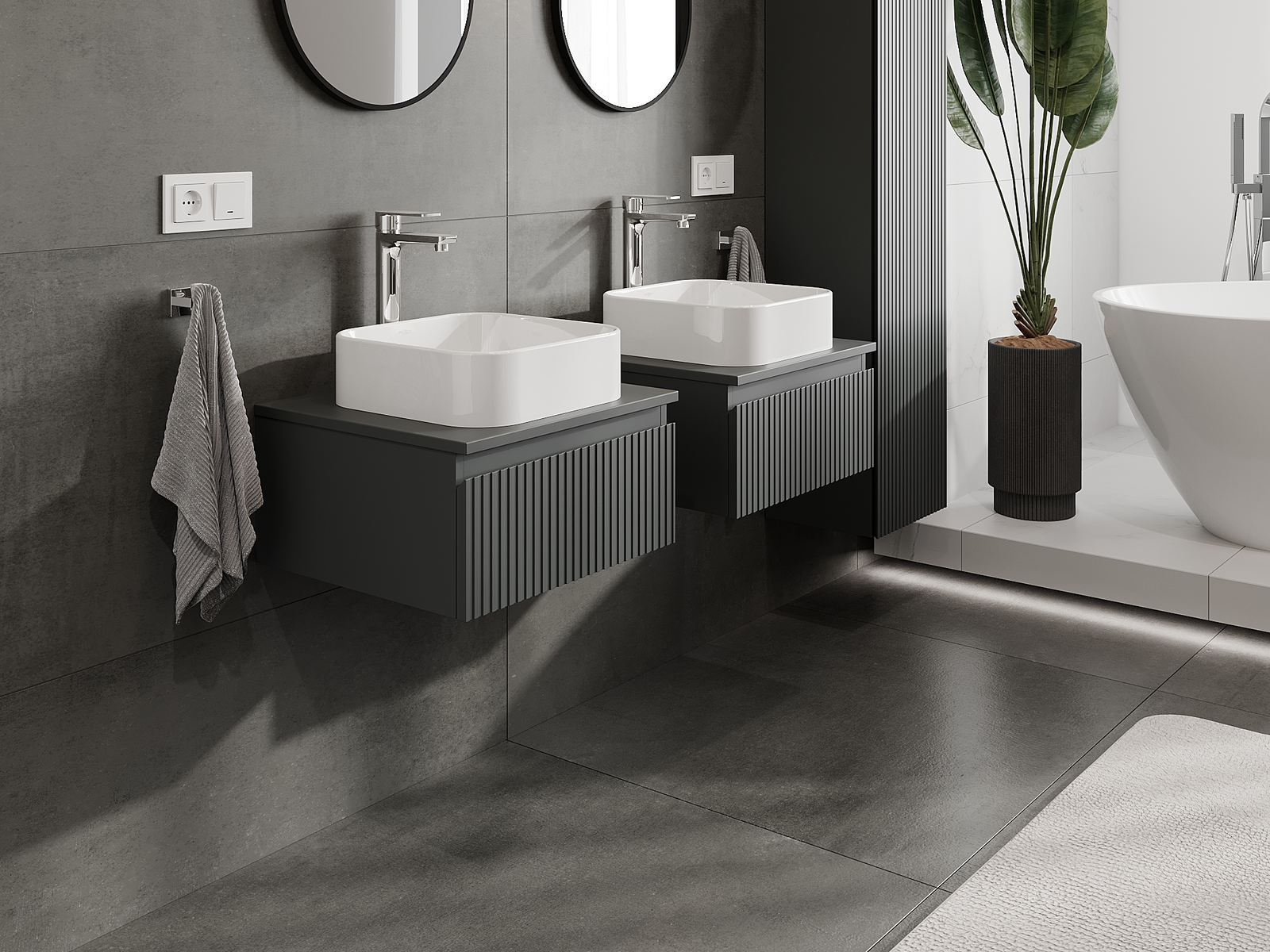 Unsere modularen Badezimmermöbel können in verschiedenen Farbkonfigurationen miteinander kombiniert werden, wodurch eine vollständige Personalisierung ermöglicht wird. Man kann sowohl das Aussehen als auch die Funktionen der einzelnen Elemente auswählen, was es erlaubt, die Möbel an eigene stilistische und funktionale Vorlieben anzupassen.