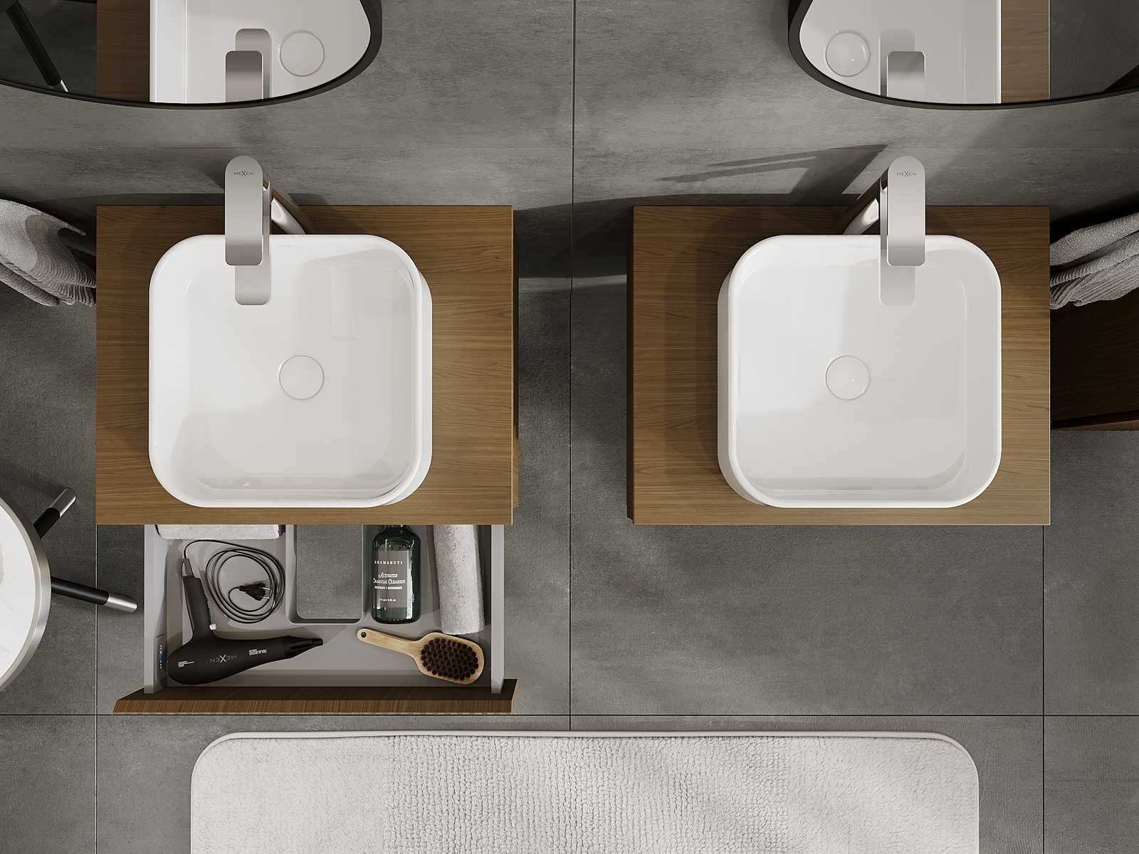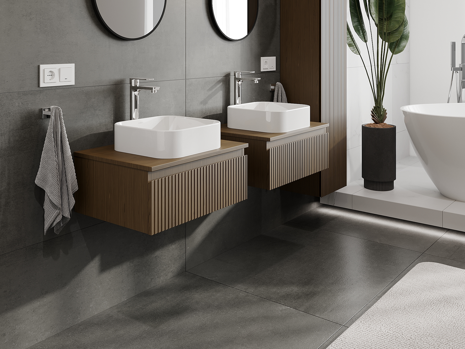 Unsere modularen Badezimmermöbel können in verschiedenen Farbkonfigurationen miteinander kombiniert werden, wodurch eine vollständige Personalisierung ermöglicht wird. Man kann sowohl das Aussehen als auch die Funktionen der einzelnen Elemente auswählen, was es erlaubt, die Möbel an eigene stilistische und funktionale Vorlieben anzupassen.