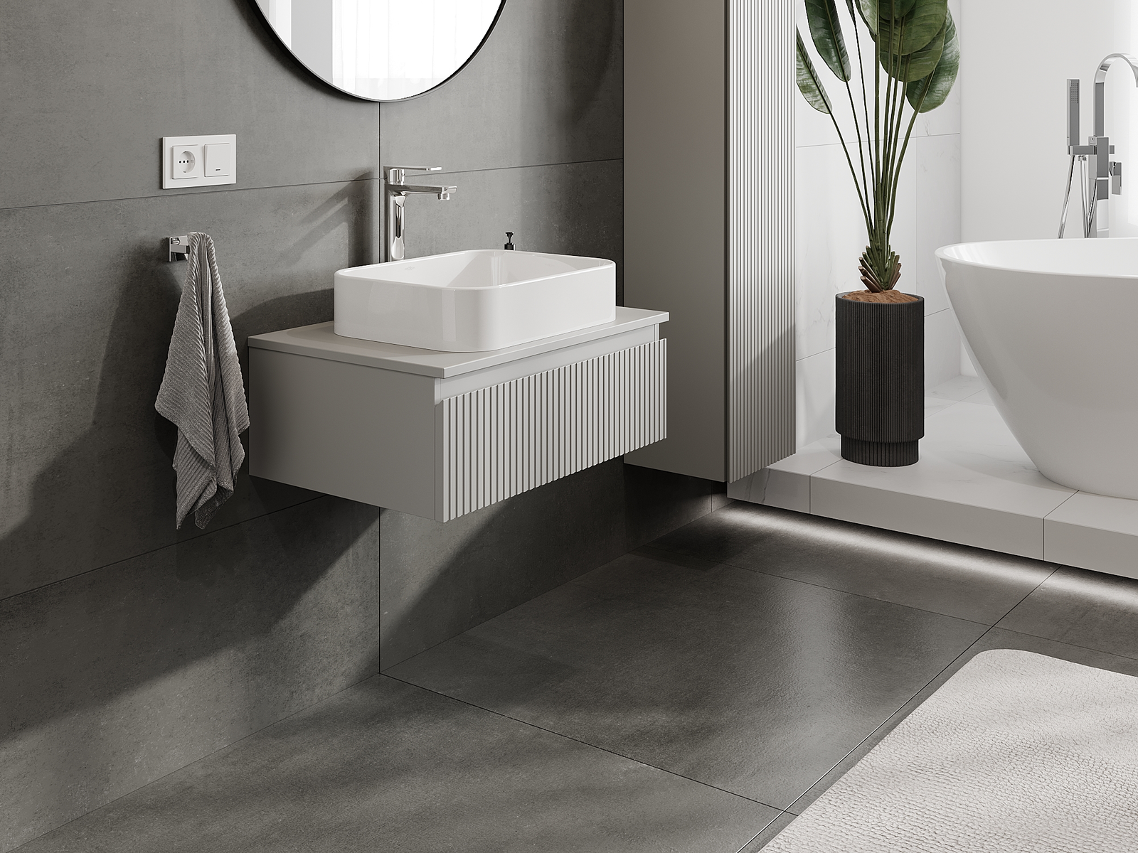 Unsere modularen Badezimmermöbel können in verschiedenen Farbkonfigurationen miteinander kombiniert werden, wodurch eine vollständige Personalisierung ermöglicht wird. Man kann sowohl das Aussehen als auch die Funktionen der einzelnen Elemente auswählen, was es erlaubt, die Möbel an eigene stilistische und funktionale Vorlieben anzupassen.
