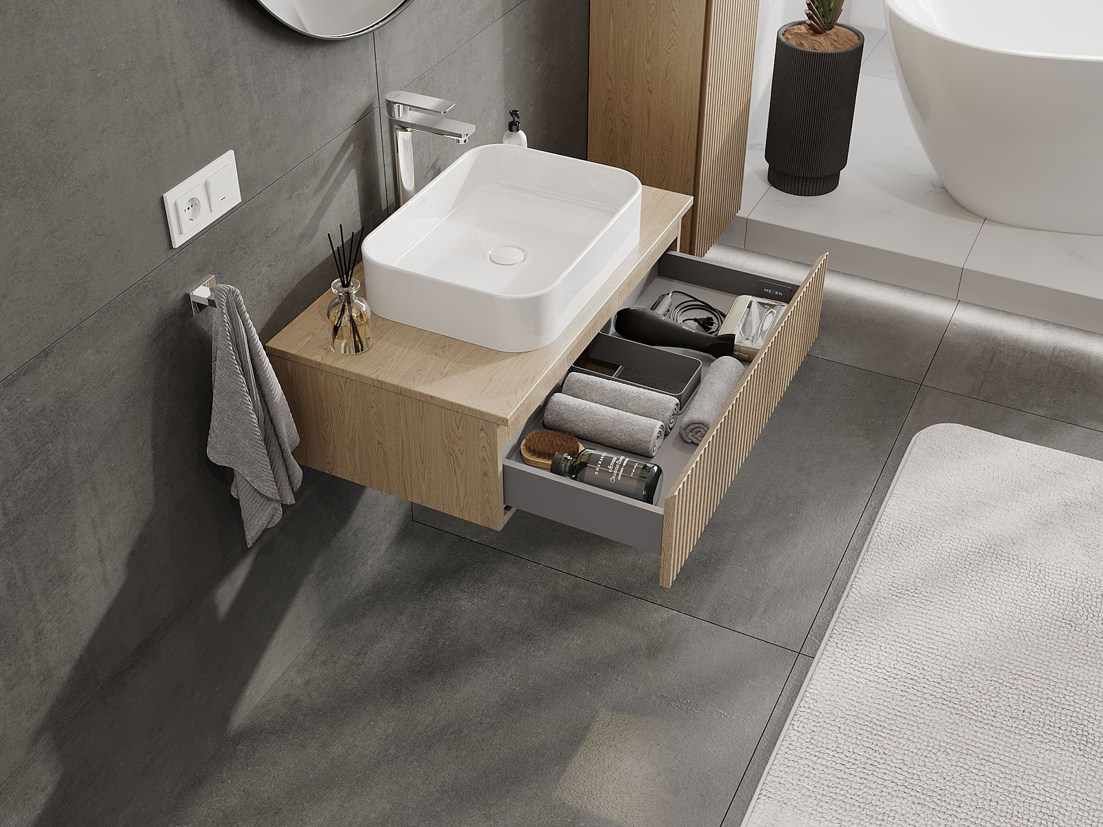 Unsere modularen Badezimmermöbel können in verschiedenen Farbkonfigurationen miteinander kombiniert werden, wodurch eine vollständige Personalisierung ermöglicht wird. Man kann sowohl das Aussehen als auch die Funktionen der einzelnen Elemente auswählen, was es erlaubt, die Möbel an eigene stilistische und funktionale Vorlieben anzupassen.