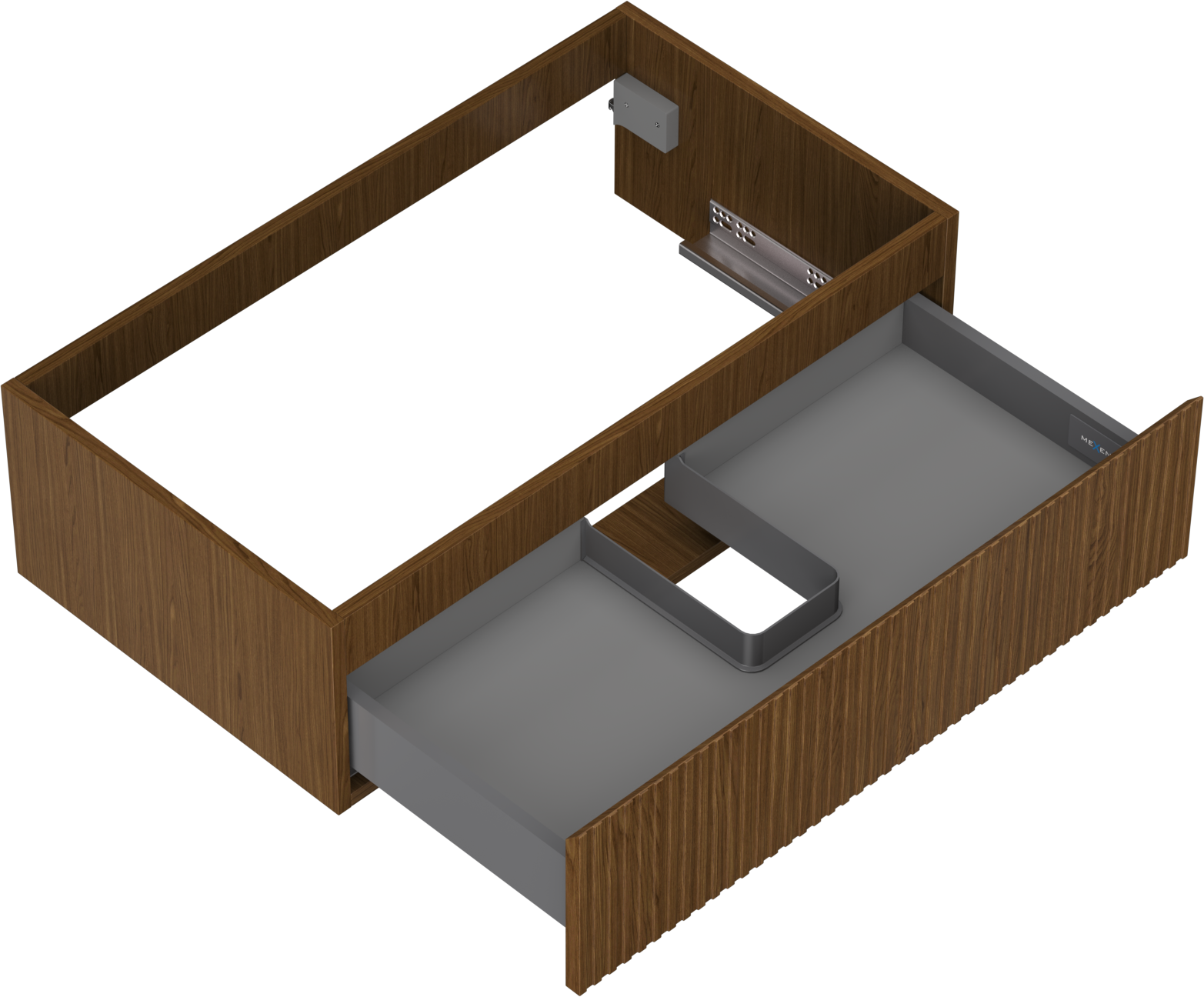 Der Ausschnitt in der Schublade ist so gestaltet, dass er den Siphon aufnehmen kann, der für Waschbeckeninstallationen erforderlich ist. Dadurch kann das Möbelstück voll funktionsfähig montiert werden, ohne auf den Platz in der Schublade zugunsten der Installation verzichten zu müssen.
