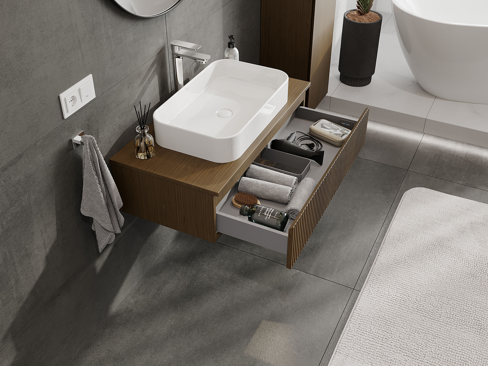 Mexen Rivel Badezimmerunterschrank 90 cm, 1 Schublade, geriffelt, Nussbaum - 91A20-09023-1-BF86