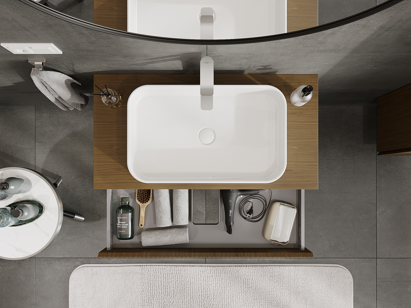 Der Ausschnitt in der Schublade ist so gestaltet, dass er den Siphon aufnehmen kann, der für Waschbeckeninstallationen erforderlich ist. Dadurch kann das Möbelstück voll funktionsfähig montiert werden, ohne auf den Platz in der Schublade zugunsten der Installation verzichten zu müssen.