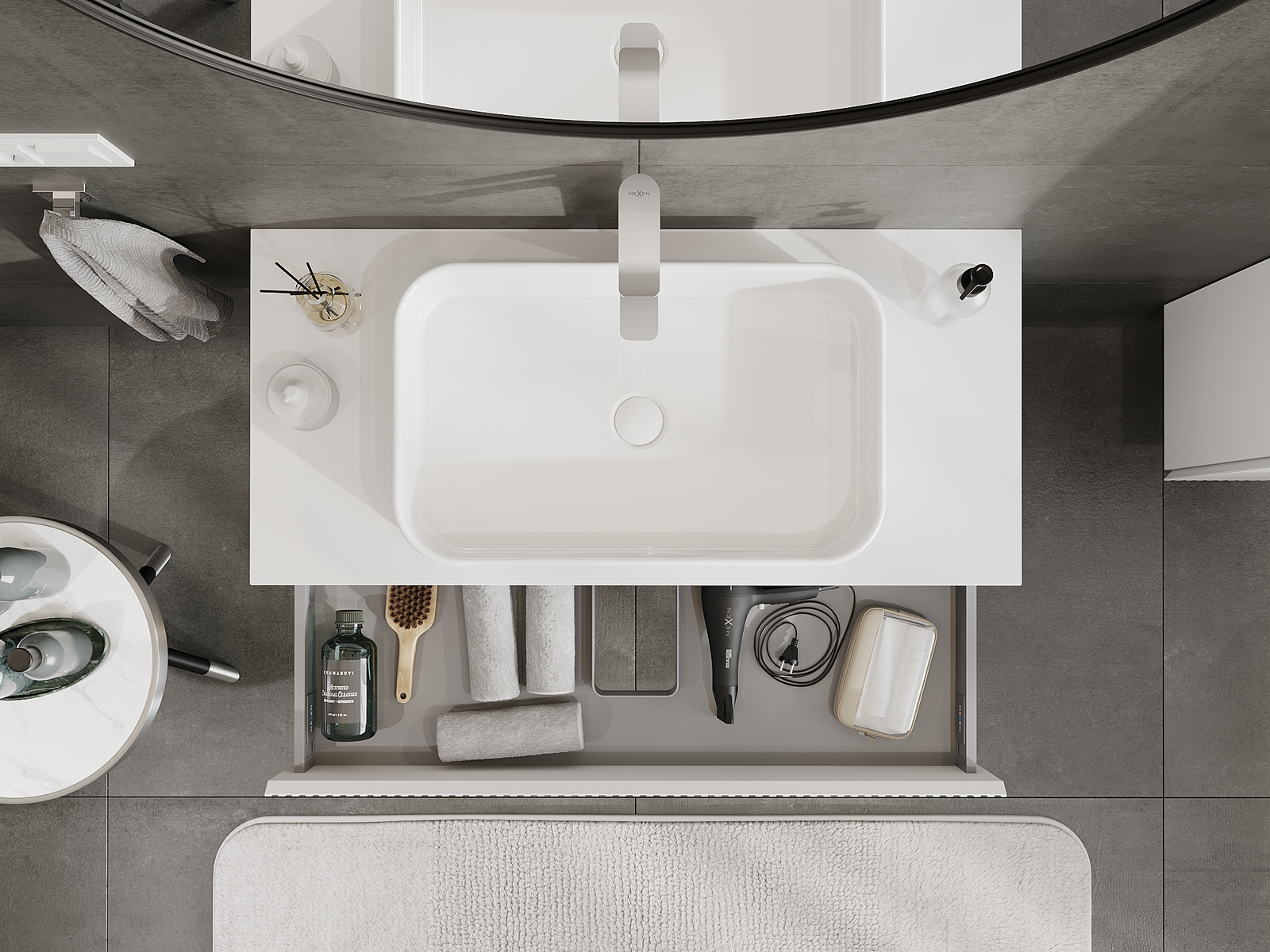 Der Ausschnitt in der Schublade ist so gestaltet, dass er den Siphon aufnehmen kann, der für Waschbeckeninstallationen erforderlich ist. Dadurch kann das Möbelstück voll funktionsfähig montiert werden, ohne auf den Platz in der Schublade zugunsten der Installation verzichten zu müssen.