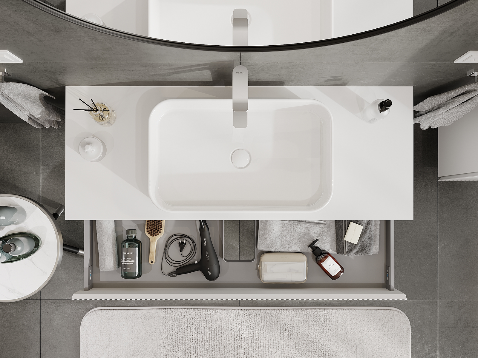 Der Ausschnitt in der Schublade ist so gestaltet, dass er den Siphon aufnehmen kann, der für Waschbeckeninstallationen erforderlich ist. Dadurch kann das Möbelstück voll funktionsfähig montiert werden, ohne auf den Platz in der Schublade zugunsten der Installation verzichten zu müssen.