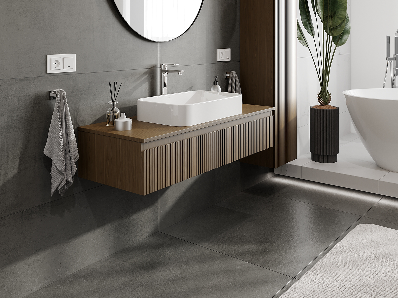 Unsere modularen Badezimmermöbel können in verschiedenen Farbkonfigurationen miteinander kombiniert werden, wodurch eine vollständige Personalisierung ermöglicht wird. Man kann sowohl das Aussehen als auch die Funktionen der einzelnen Elemente auswählen, was es erlaubt, die Möbel an eigene stilistische und funktionale Vorlieben anzupassen.
