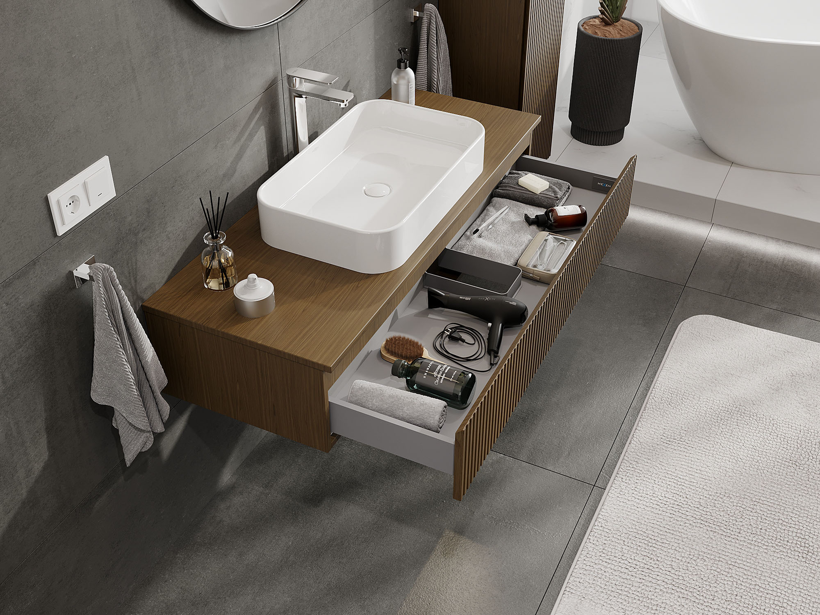Mexen Rivel Badezimmerschrank für Waschbecken 120 cm, 1 Schublade, geriffelt, Nussbaum - 91A20-12023-1-BF86