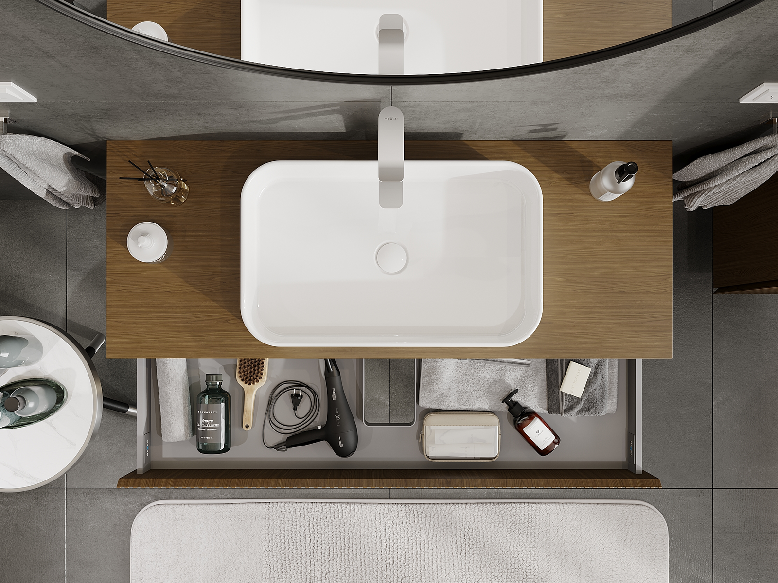 Der Ausschnitt in der Schublade ist so gestaltet, dass er den Siphon aufnehmen kann, der für Waschbeckeninstallationen erforderlich ist. Dadurch kann das Möbelstück voll funktionsfähig montiert werden, ohne auf den Platz in der Schublade zugunsten der Installation verzichten zu müssen.