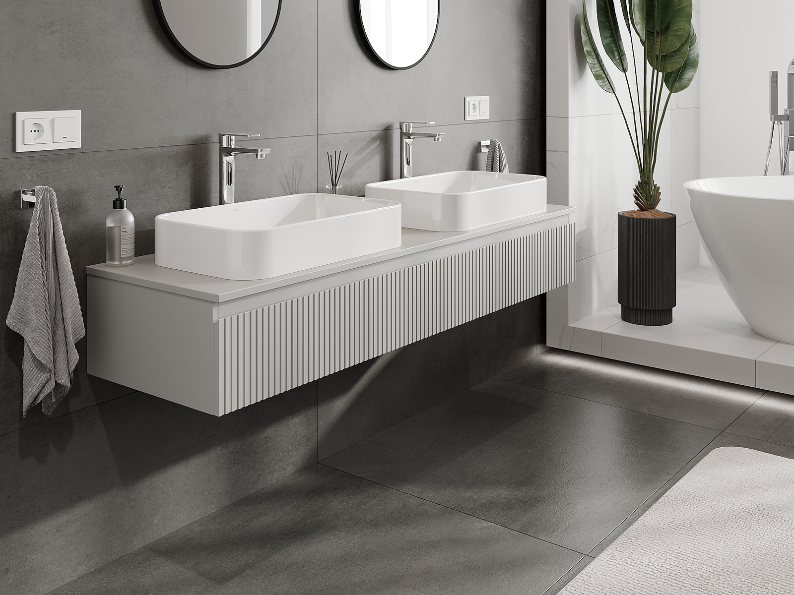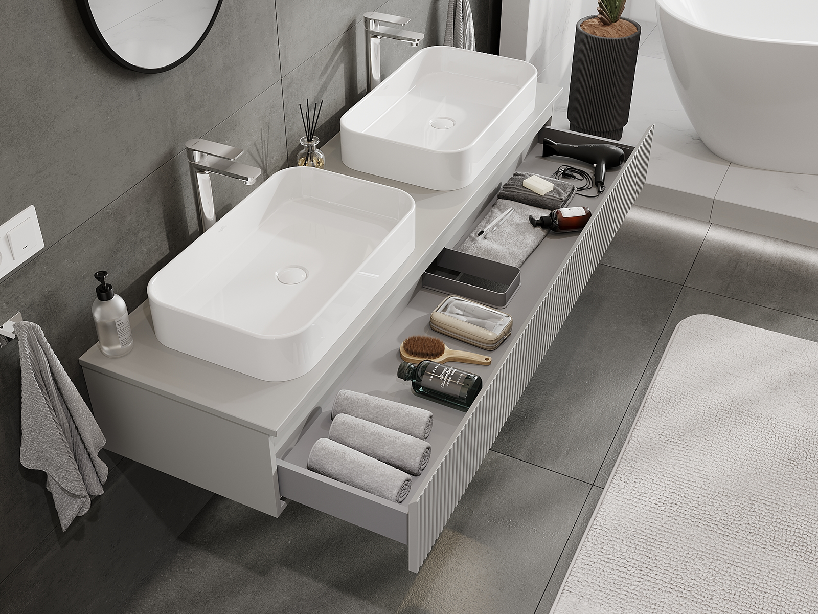 Unsere modularen Badezimmermöbel können in verschiedenen Farbkonfigurationen miteinander kombiniert werden, wodurch eine vollständige Personalisierung ermöglicht wird. Man kann sowohl das Aussehen als auch die Funktionen der einzelnen Elemente auswählen, was es erlaubt, die Möbel an eigene stilistische und funktionale Vorlieben anzupassen.