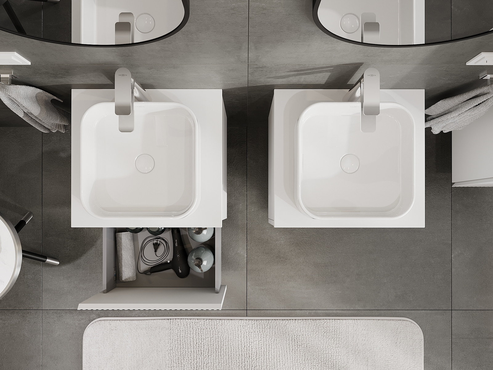 Unsere modularen Badezimmermöbel können in verschiedenen Farbkonfigurationen miteinander kombiniert werden, wodurch eine vollständige Personalisierung ermöglicht wird. Man kann sowohl das Aussehen als auch die Funktionen der einzelnen Elemente auswählen, was es erlaubt, die Möbel an eigene stilistische und funktionale Vorlieben anzupassen.