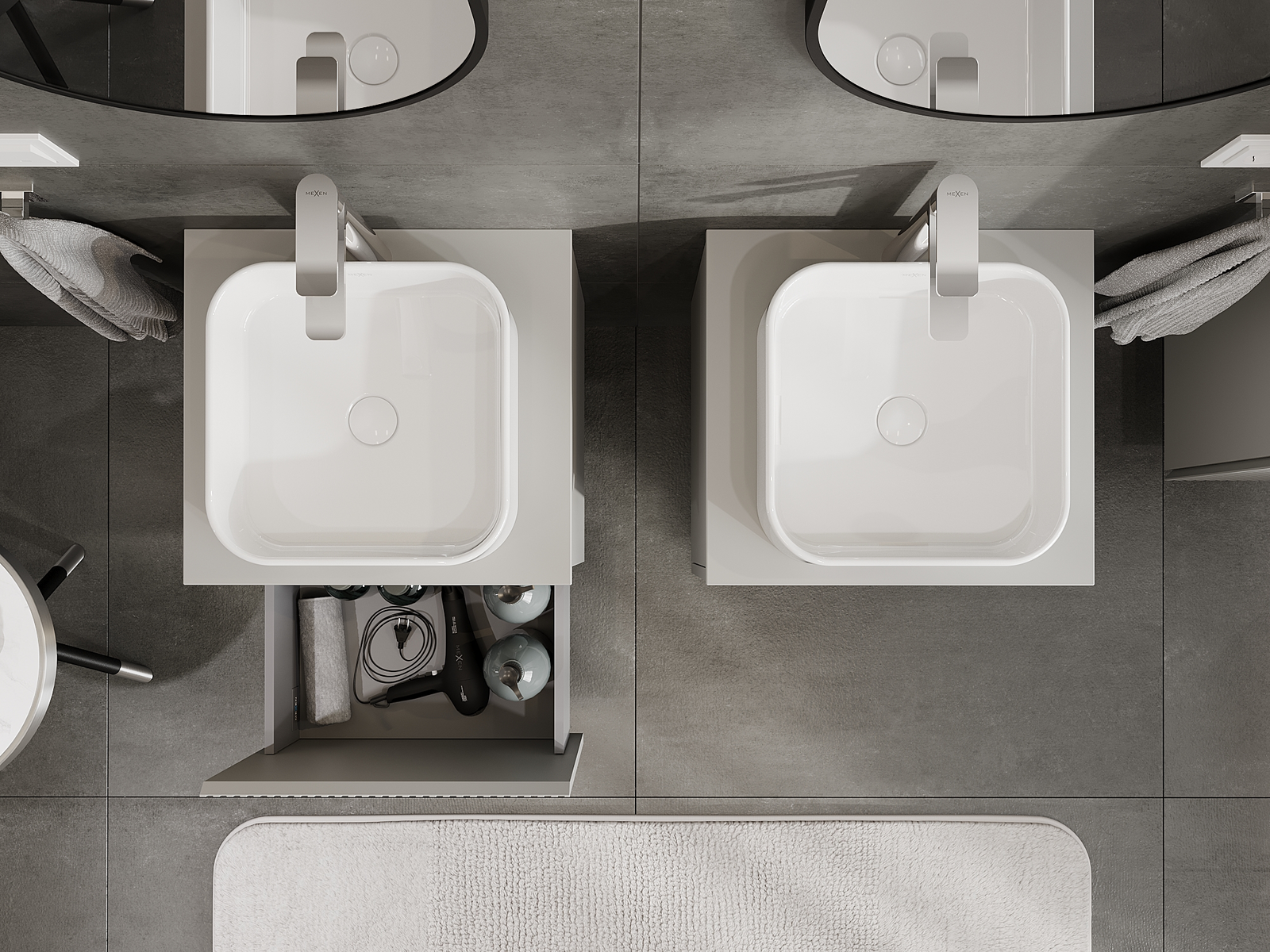 Unsere modularen Badezimmermöbel können in verschiedenen Farbkonfigurationen miteinander kombiniert werden, wodurch eine vollständige Personalisierung ermöglicht wird. Man kann sowohl das Aussehen als auch die Funktionen der einzelnen Elemente auswählen, was es erlaubt, die Möbel an eigene stilistische und funktionale Vorlieben anzupassen.