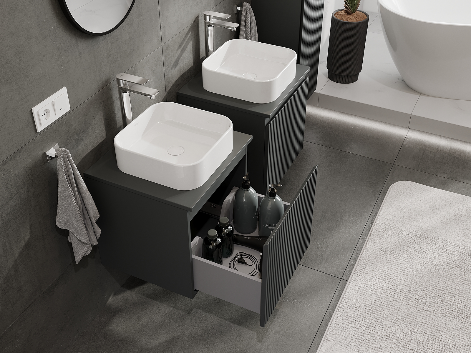 Unsere modularen Badezimmermöbel können in verschiedenen Farbkonfigurationen miteinander kombiniert werden, wodurch eine vollständige Personalisierung ermöglicht wird. Man kann sowohl das Aussehen als auch die Funktionen der einzelnen Elemente auswählen, was es erlaubt, die Möbel an eigene stilistische und funktionale Vorlieben anzupassen.