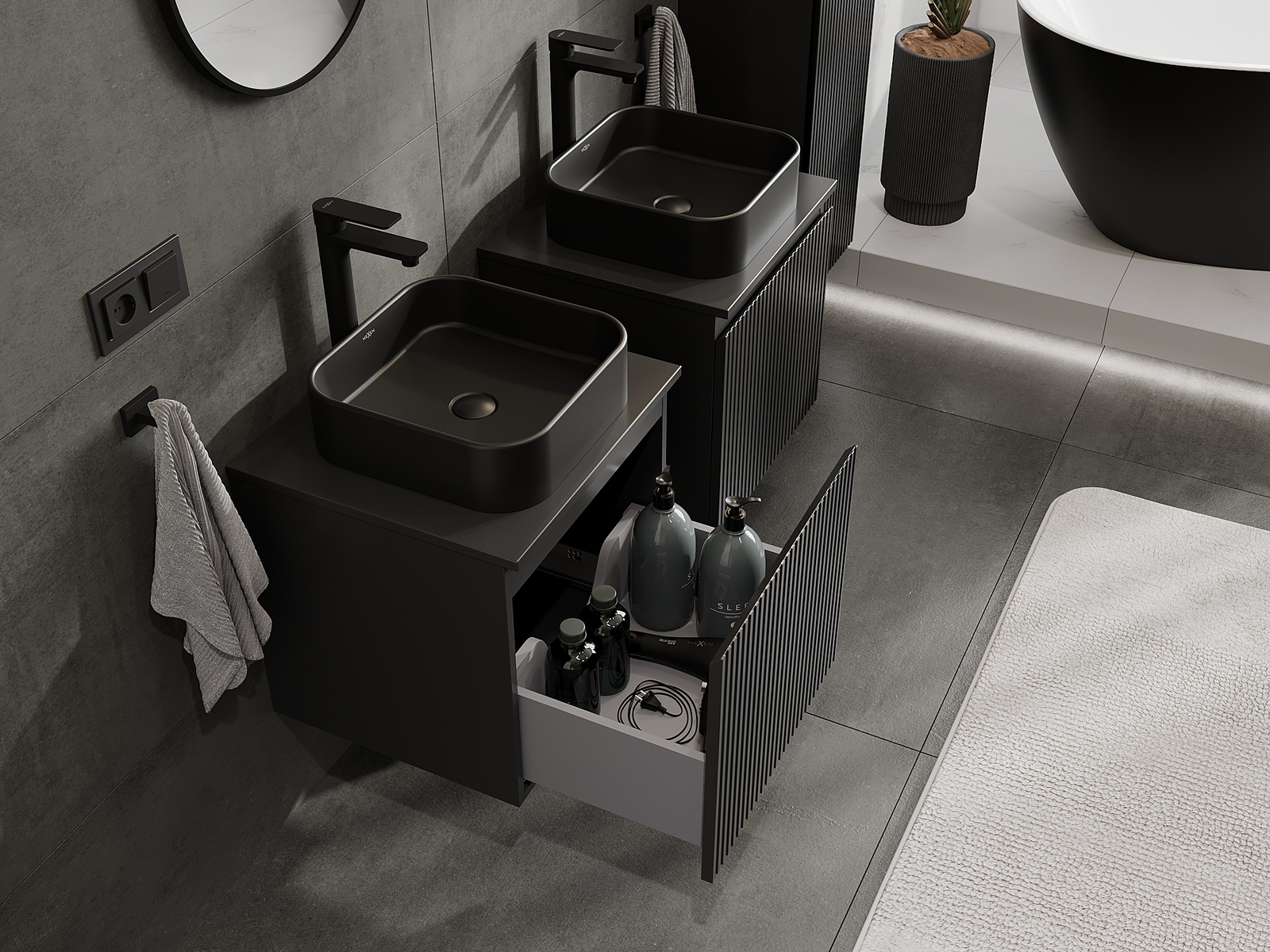 Unsere modularen Badezimmermöbel können in verschiedenen Farbkonfigurationen miteinander kombiniert werden, wodurch eine vollständige Personalisierung ermöglicht wird. Man kann sowohl das Aussehen als auch die Funktionen der einzelnen Elemente auswählen, was es erlaubt, die Möbel an eigene stilistische und funktionale Vorlieben anzupassen.