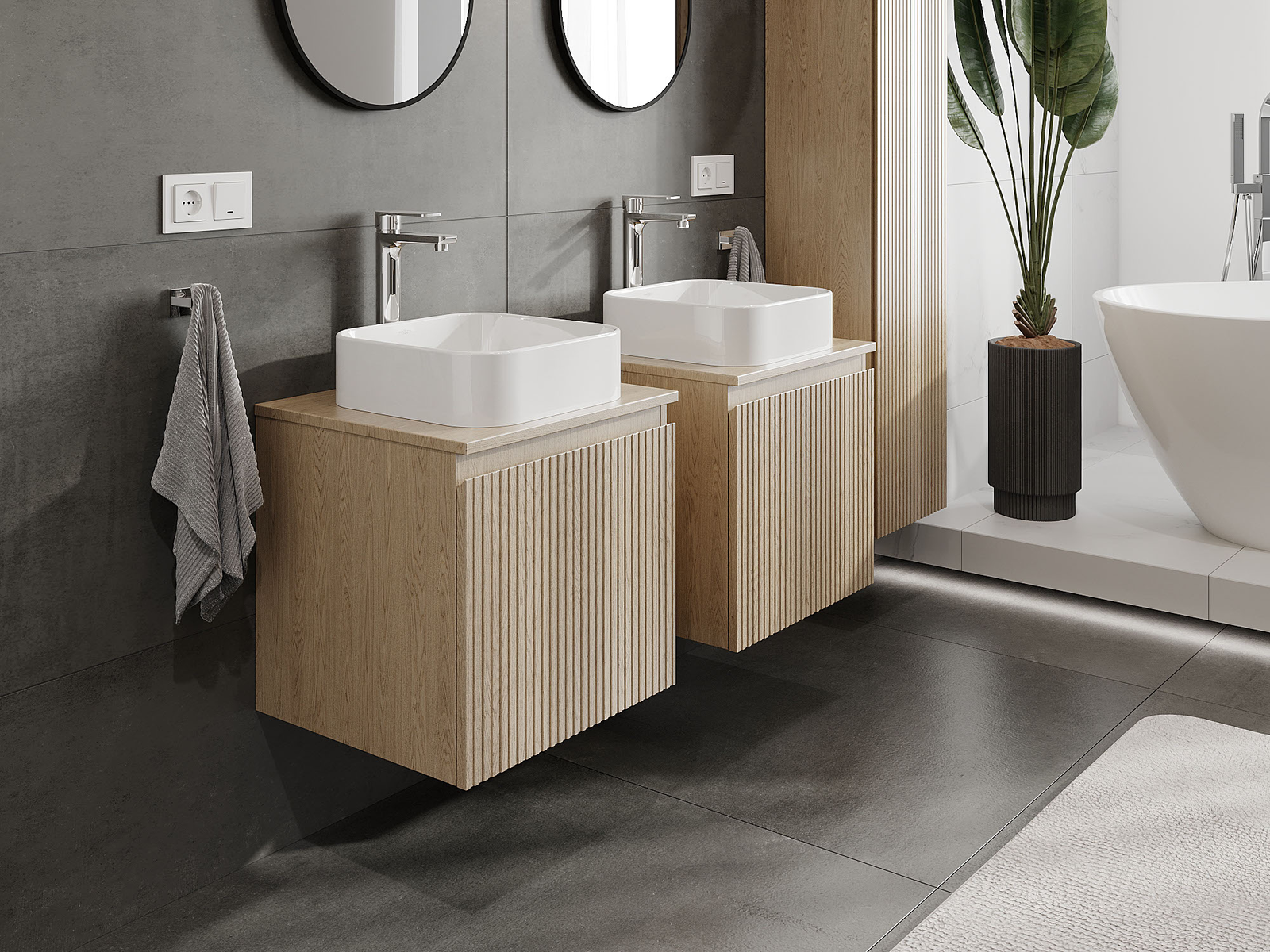 Unsere modularen Badezimmermöbel können in verschiedenen Farbkonfigurationen miteinander kombiniert werden, wodurch eine vollständige Personalisierung ermöglicht wird. Man kann sowohl das Aussehen als auch die Funktionen der einzelnen Elemente auswählen, was es erlaubt, die Möbel an eigene stilistische und funktionale Vorlieben anzupassen.