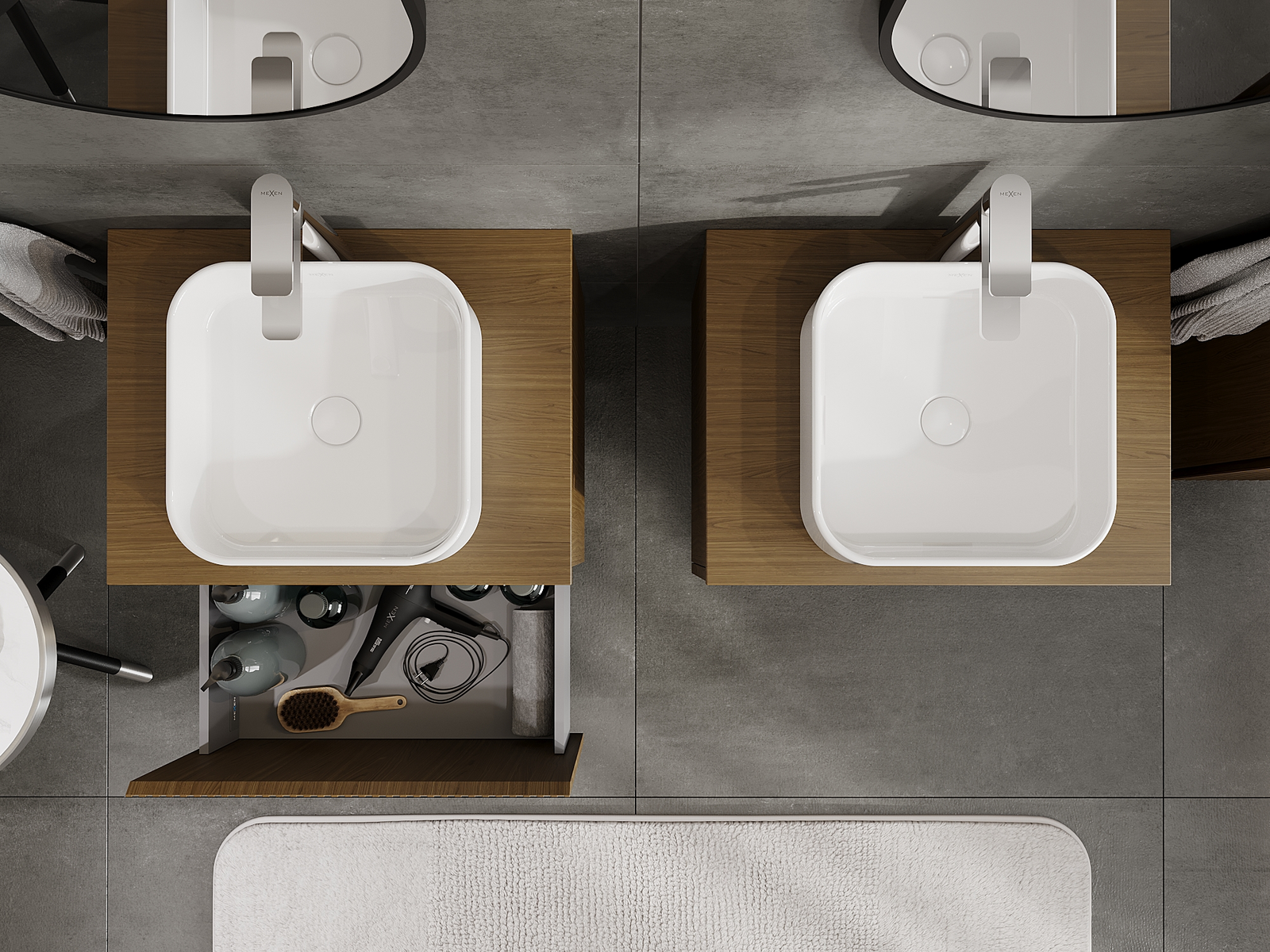 Unsere modularen Badezimmermöbel können in verschiedenen Farbkonfigurationen miteinander kombiniert werden, wodurch eine vollständige Personalisierung ermöglicht wird. Man kann sowohl das Aussehen als auch die Funktionen der einzelnen Elemente auswählen, was es erlaubt, die Möbel an eigene stilistische und funktionale Vorlieben anzupassen.