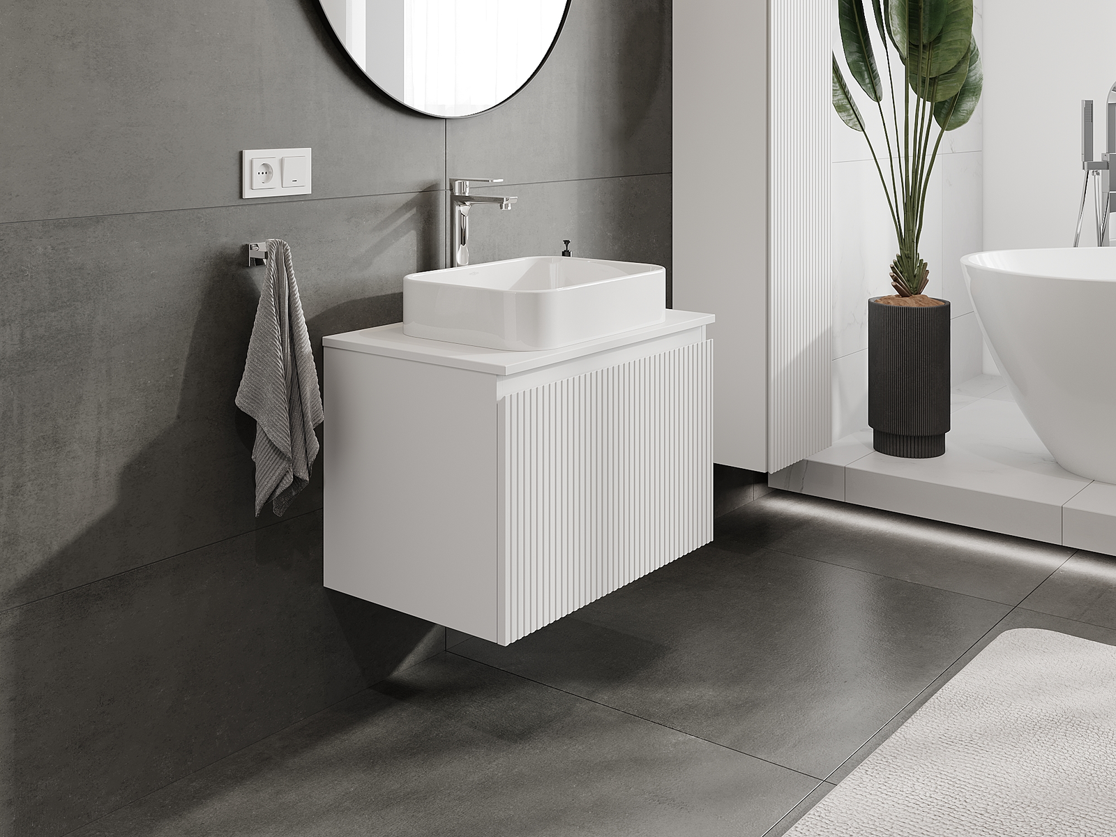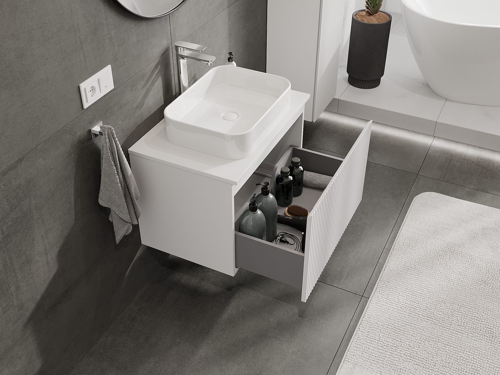 Unsere modularen Badezimmermöbel können in verschiedenen Farbkonfigurationen miteinander kombiniert werden, wodurch eine vollständige Personalisierung ermöglicht wird. Man kann sowohl das Aussehen als auch die Funktionen der einzelnen Elemente auswählen, was es erlaubt, die Möbel an eigene stilistische und funktionale Vorlieben anzupassen.
