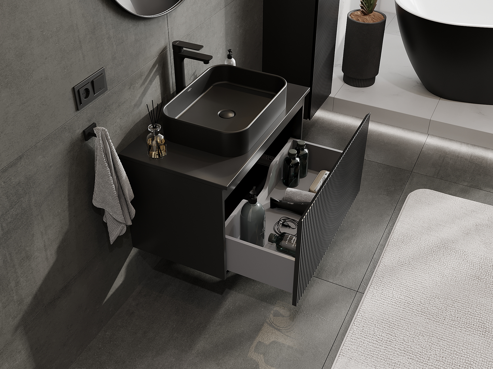 Unsere modularen Badezimmermöbel können in verschiedenen Farbkonfigurationen miteinander kombiniert werden, wodurch eine vollständige Personalisierung ermöglicht wird. Man kann sowohl das Aussehen als auch die Funktionen der einzelnen Elemente auswählen, was es erlaubt, die Möbel an eigene stilistische und funktionale Vorlieben anzupassen.