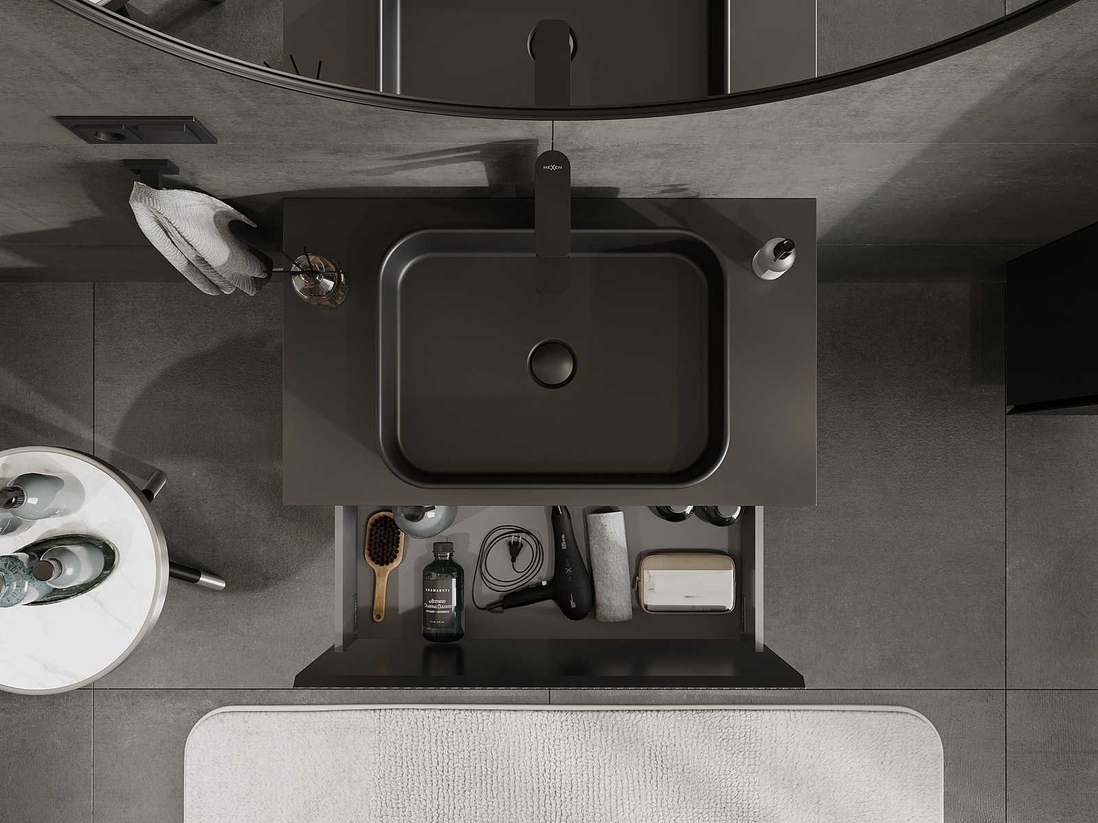 Der Ausschnitt in der Schublade ist so gestaltet, dass er den Siphon aufnehmen kann, der für Waschbeckeninstallationen erforderlich ist. Dadurch kann das Möbelstück voll funktionsfähig montiert werden, ohne auf den Platz in der Schublade zugunsten der Installation verzichten zu müssen.