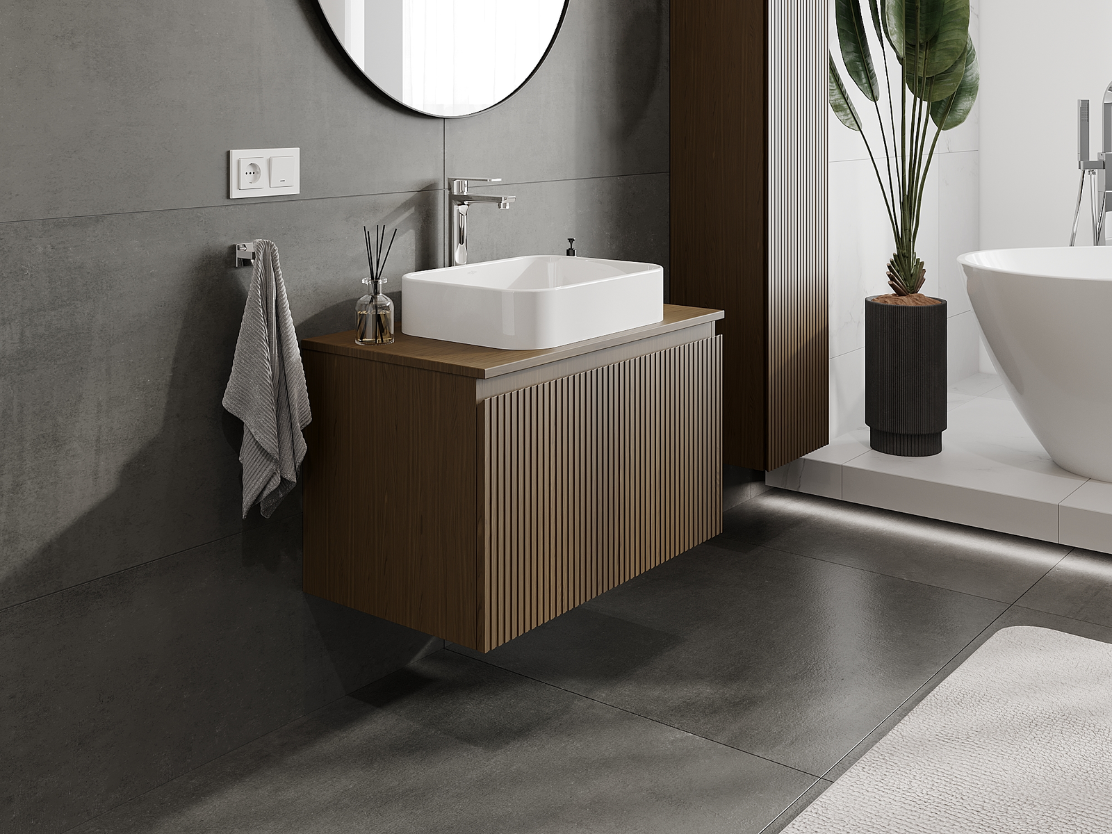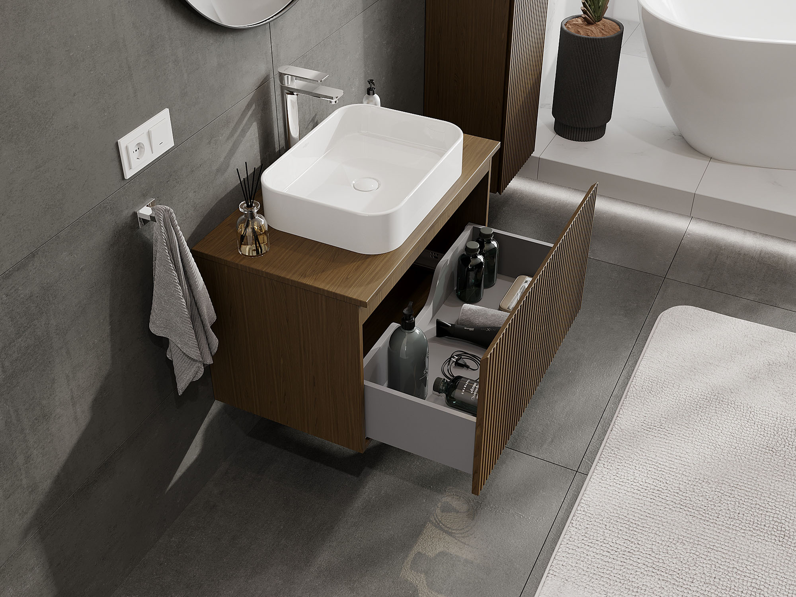 Unsere modularen Badezimmermöbel können in verschiedenen Farbkonfigurationen miteinander kombiniert werden, wodurch eine vollständige Personalisierung ermöglicht wird. Man kann sowohl das Aussehen als auch die Funktionen der einzelnen Elemente auswählen, was es erlaubt, die Möbel an eigene stilistische und funktionale Vorlieben anzupassen.
