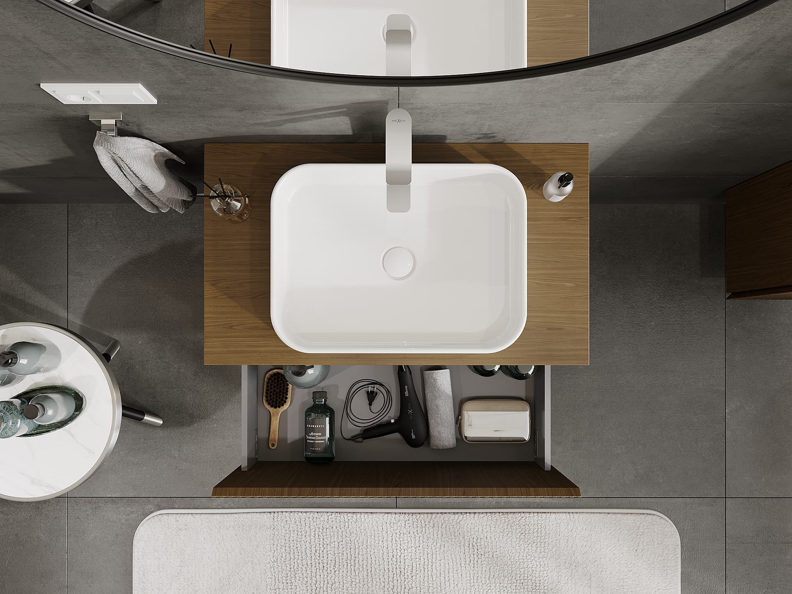 Der Ausschnitt in der Schublade ist so gestaltet, dass er den Siphon aufnehmen kann, der für Waschbeckeninstallationen erforderlich ist. Dadurch kann das Möbelstück voll funktionsfähig montiert werden, ohne auf den Platz in der Schublade zugunsten der Installation verzichten zu müssen.
