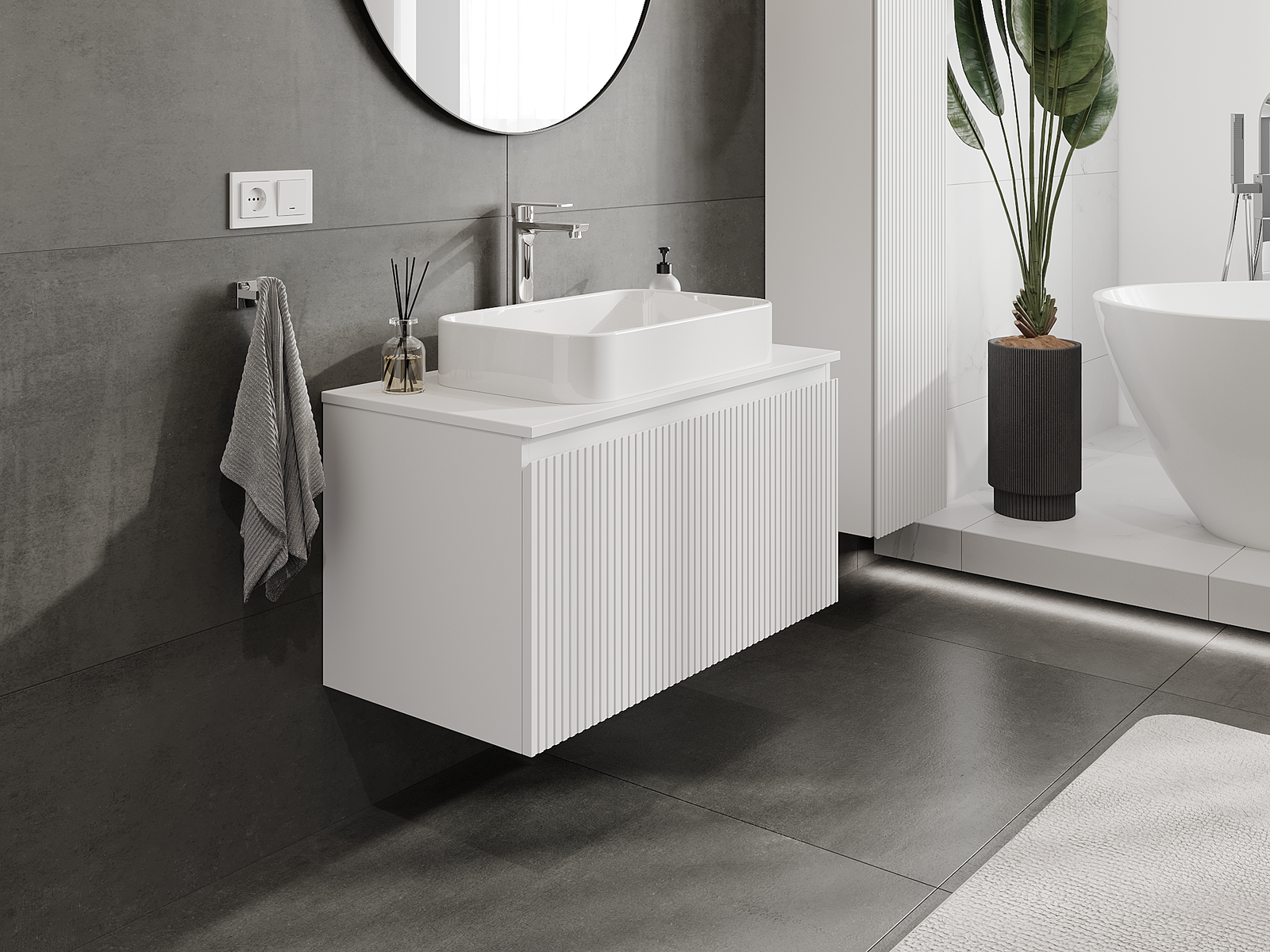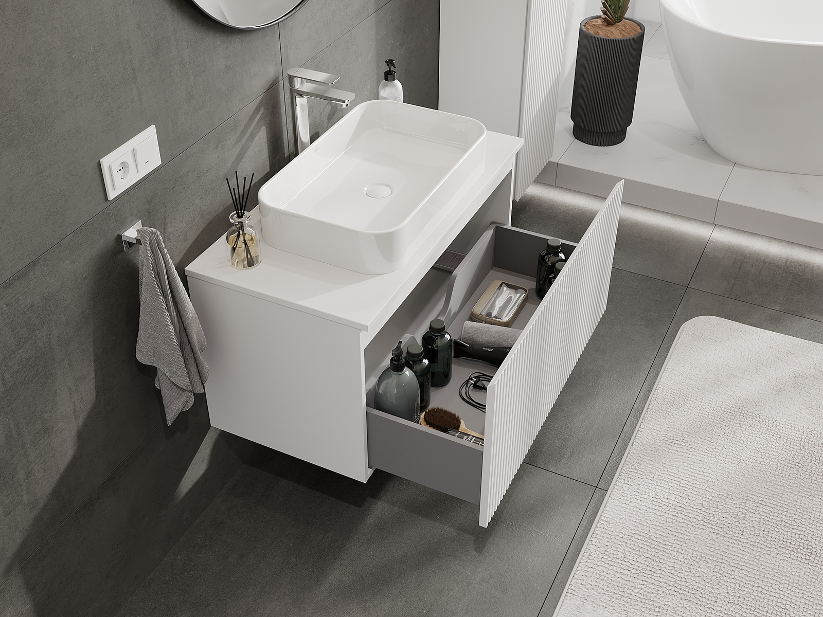 Unsere modularen Badezimmermöbel können in verschiedenen Farbkonfigurationen miteinander kombiniert werden, wodurch eine vollständige Personalisierung ermöglicht wird. Man kann sowohl das Aussehen als auch die Funktionen der einzelnen Elemente auswählen, was es erlaubt, die Möbel an eigene stilistische und funktionale Vorlieben anzupassen.