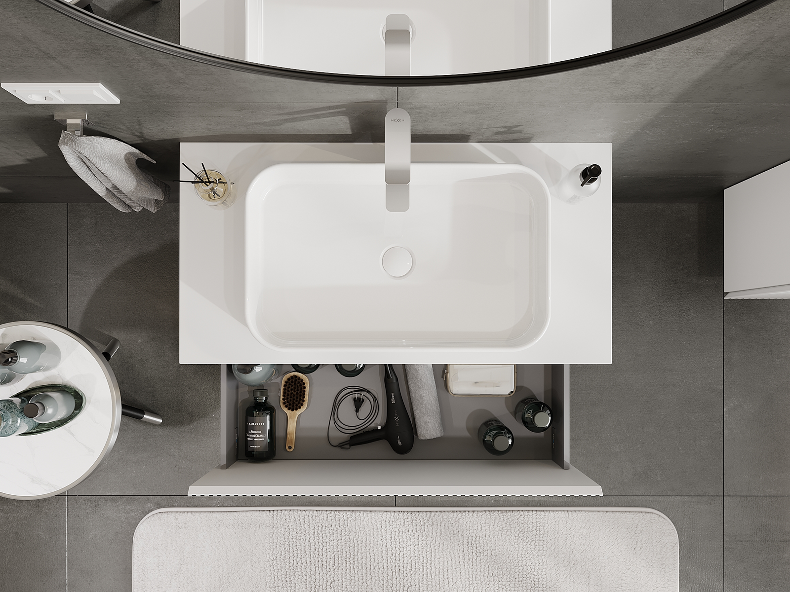 Der Ausschnitt in der Schublade ist so gestaltet, dass er den Siphon aufnehmen kann, der für Waschbeckeninstallationen erforderlich ist. Dadurch kann das Möbelstück voll funktionsfähig montiert werden, ohne auf den Platz in der Schublade zugunsten der Installation verzichten zu müssen.