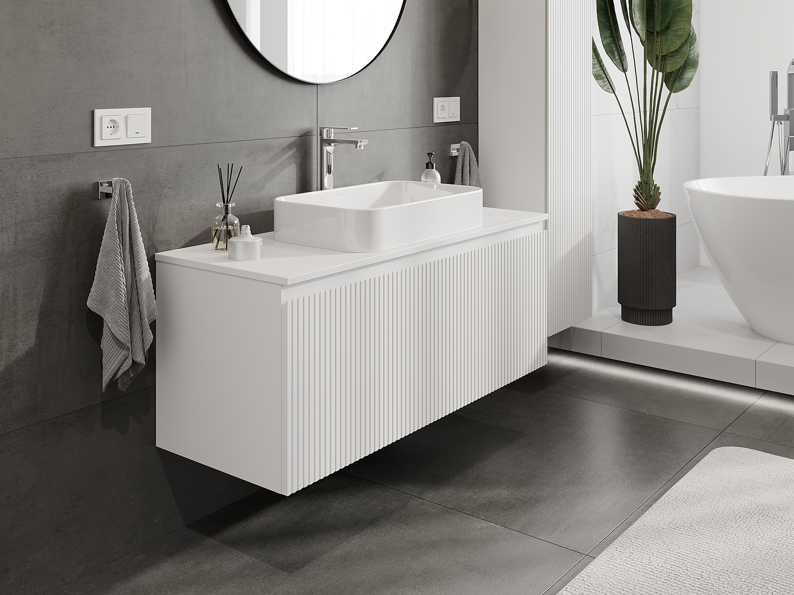 Unsere modularen Badezimmermöbel können in verschiedenen Farbkonfigurationen miteinander kombiniert werden, wodurch eine vollständige Personalisierung ermöglicht wird. Man kann sowohl das Aussehen als auch die Funktionen der einzelnen Elemente auswählen, was es erlaubt, die Möbel an eigene stilistische und funktionale Vorlieben anzupassen.