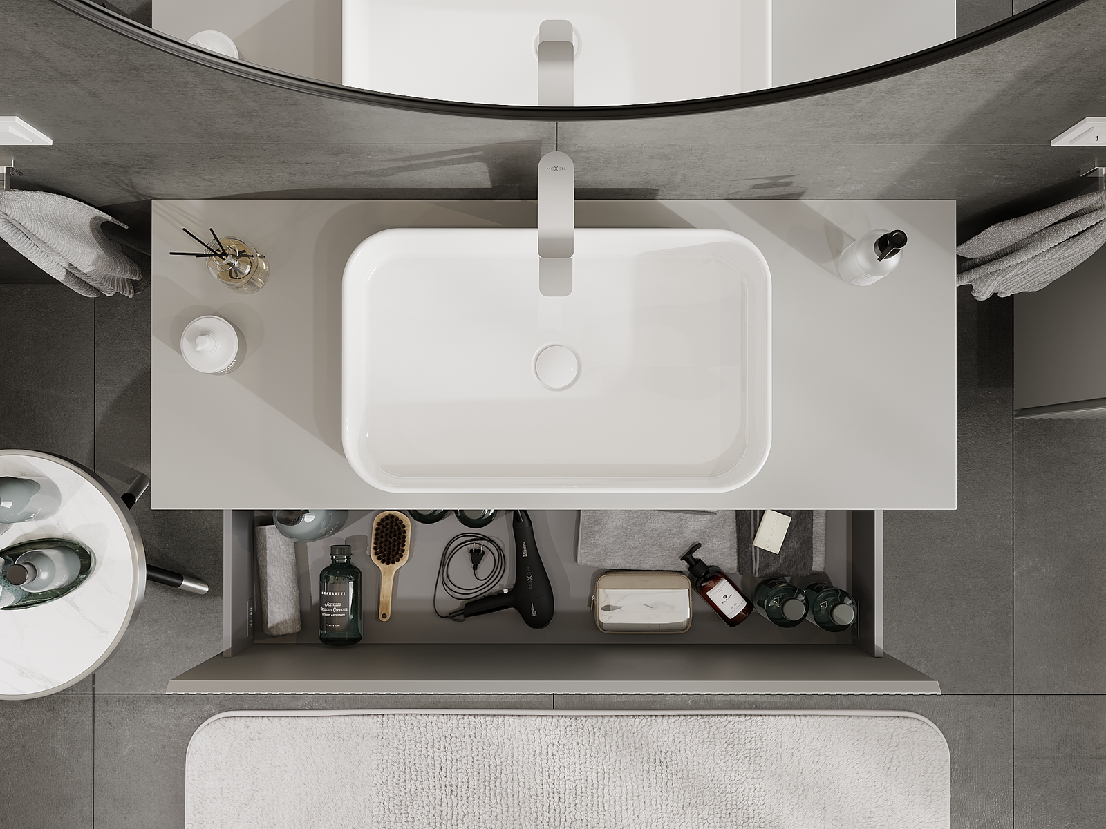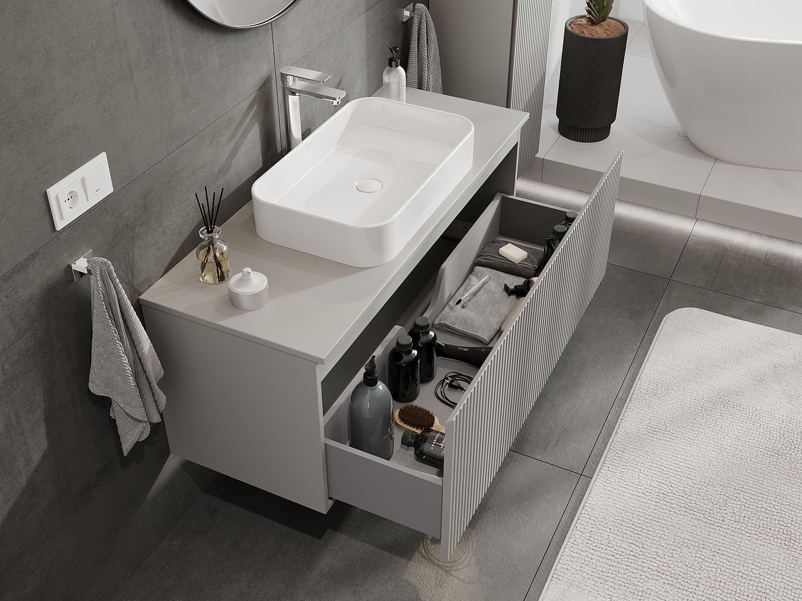 Unsere modularen Badezimmermöbel können in verschiedenen Farbkonfigurationen miteinander kombiniert werden, wodurch eine vollständige Personalisierung ermöglicht wird. Man kann sowohl das Aussehen als auch die Funktionen der einzelnen Elemente auswählen, was es erlaubt, die Möbel an eigene stilistische und funktionale Vorlieben anzupassen.