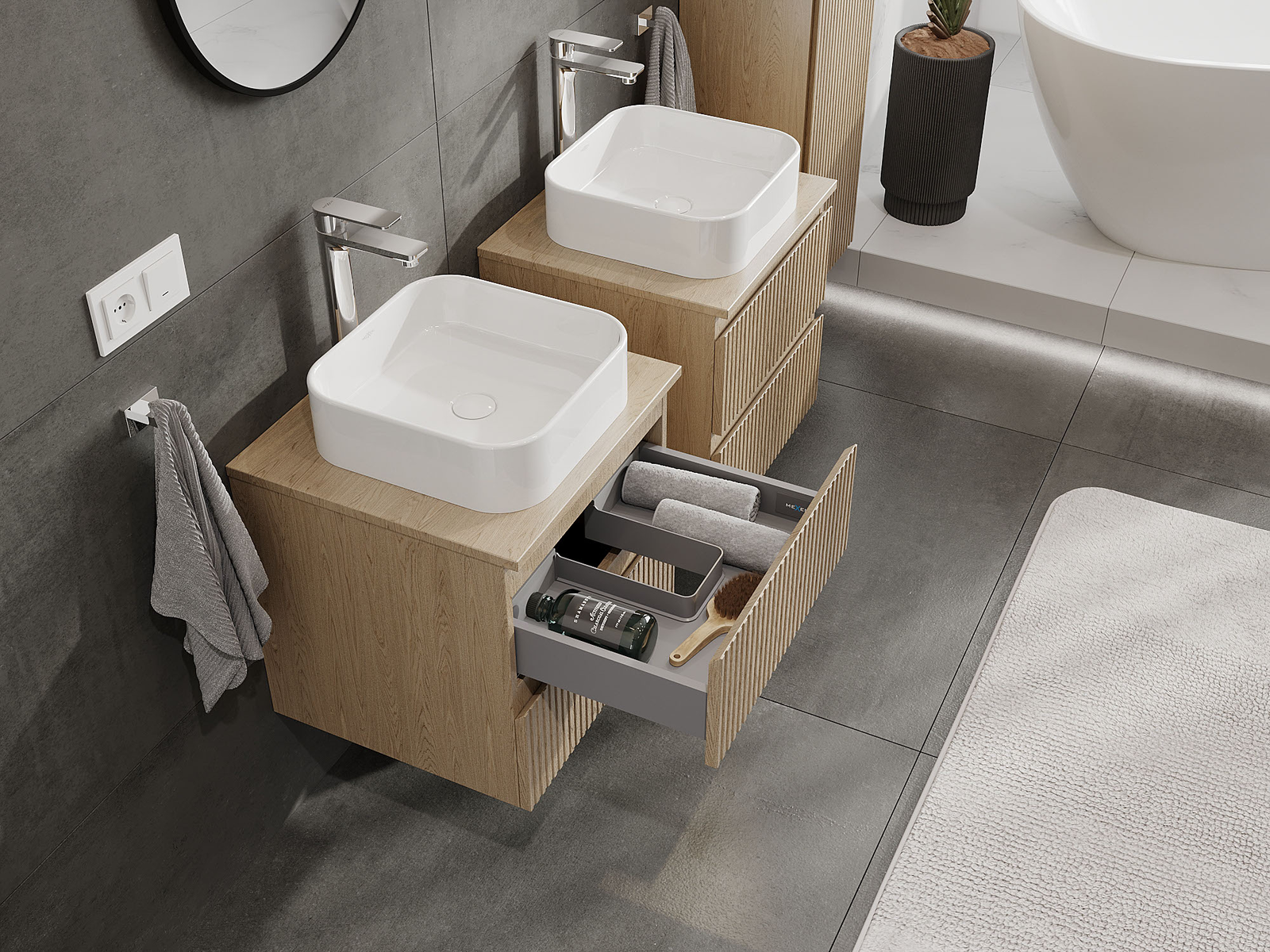 Unsere modularen Badezimmermöbel können in verschiedenen Farbkonfigurationen miteinander kombiniert werden, wodurch eine vollständige Personalisierung ermöglicht wird. Man kann sowohl das Aussehen als auch die Funktionen der einzelnen Elemente auswählen, was es erlaubt, die Möbel an eigene stilistische und funktionale Vorlieben anzupassen.
