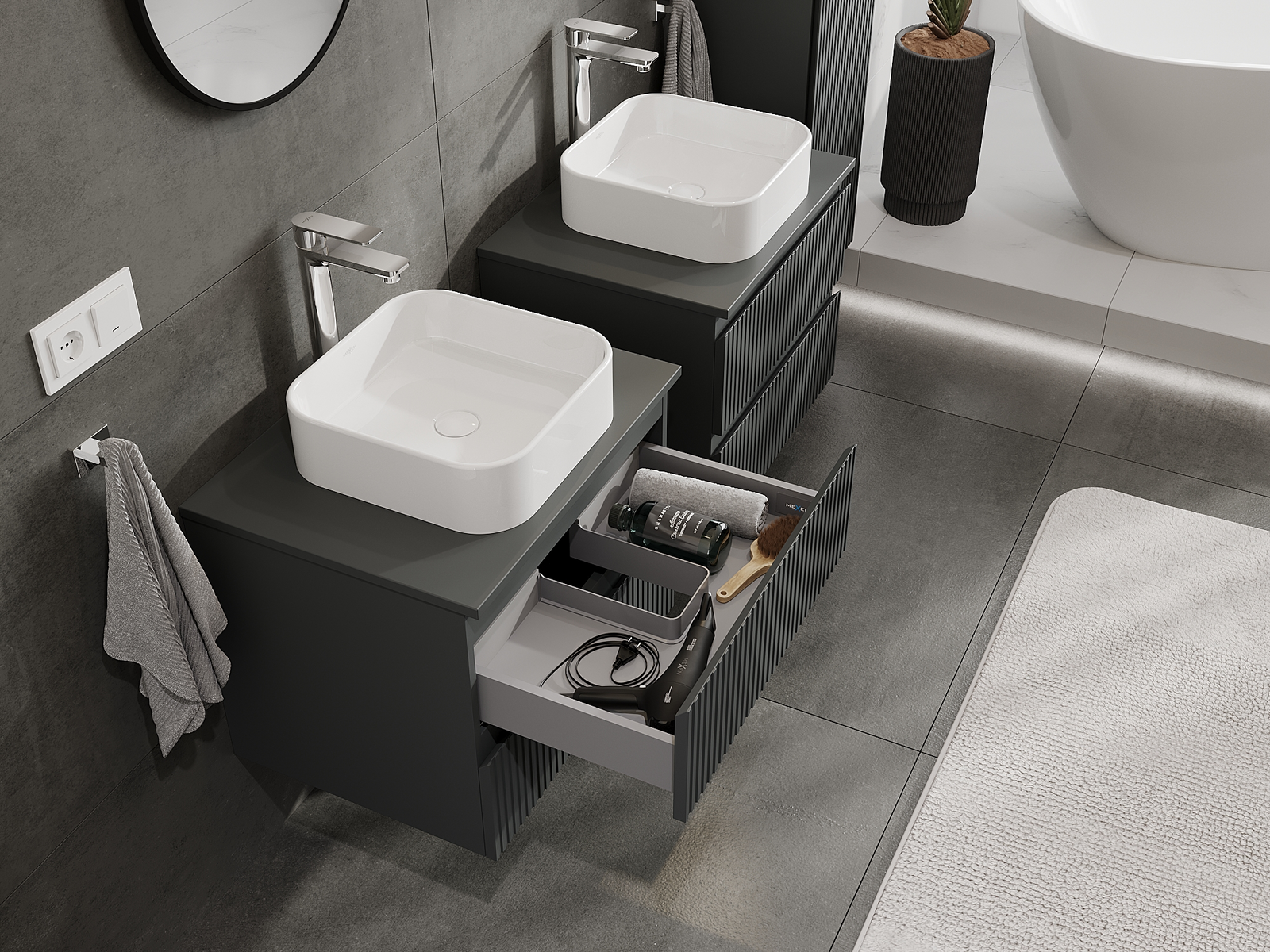 Unsere modularen Badezimmermöbel können in verschiedenen Farbkonfigurationen miteinander kombiniert werden, wodurch eine vollständige Personalisierung ermöglicht wird. Man kann sowohl das Aussehen als auch die Funktionen der einzelnen Elemente auswählen, was es erlaubt, die Möbel an eigene stilistische und funktionale Vorlieben anzupassen.