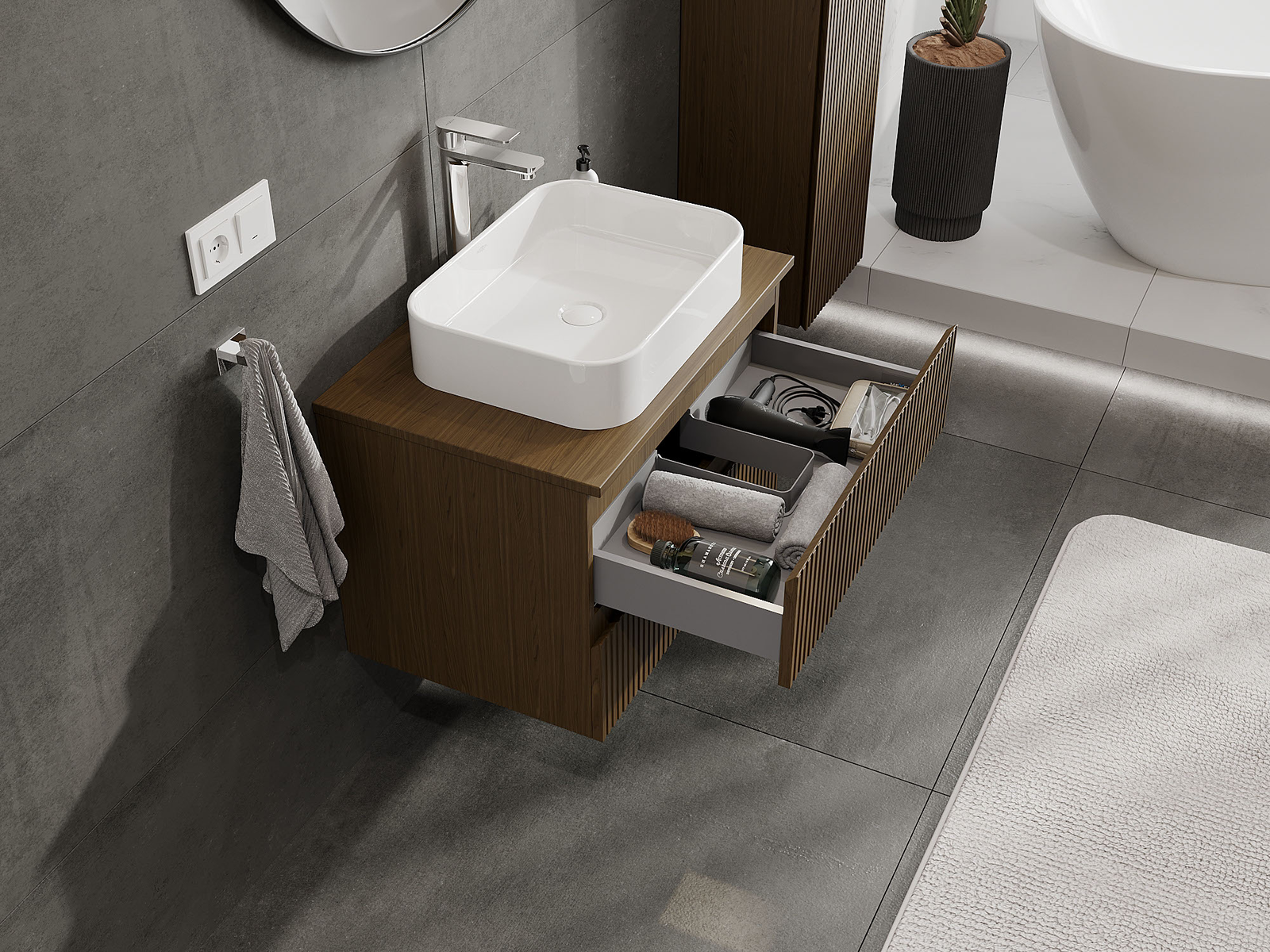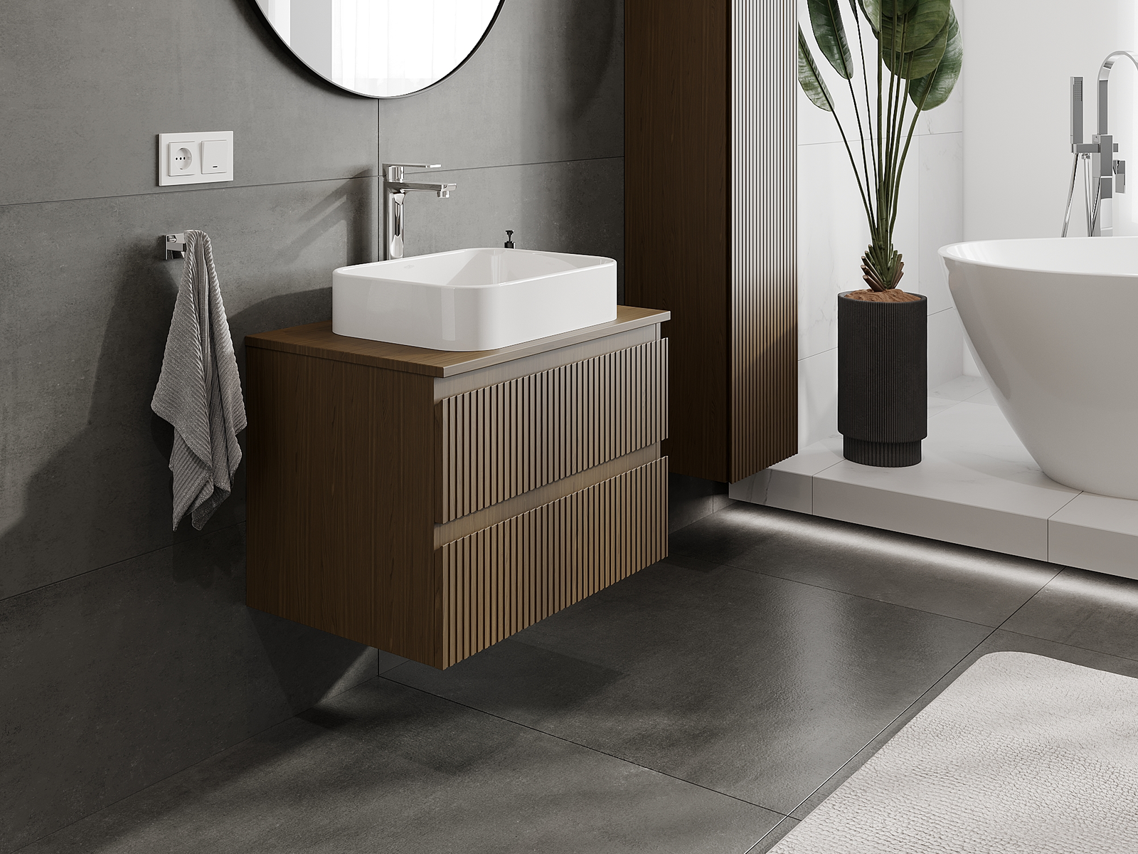 Unsere modularen Badezimmermöbel können in verschiedenen Farbkonfigurationen miteinander kombiniert werden, wodurch eine vollständige Personalisierung ermöglicht wird. Man kann sowohl das Aussehen als auch die Funktionen der einzelnen Elemente auswählen, was es erlaubt, die Möbel an eigene stilistische und funktionale Vorlieben anzupassen.