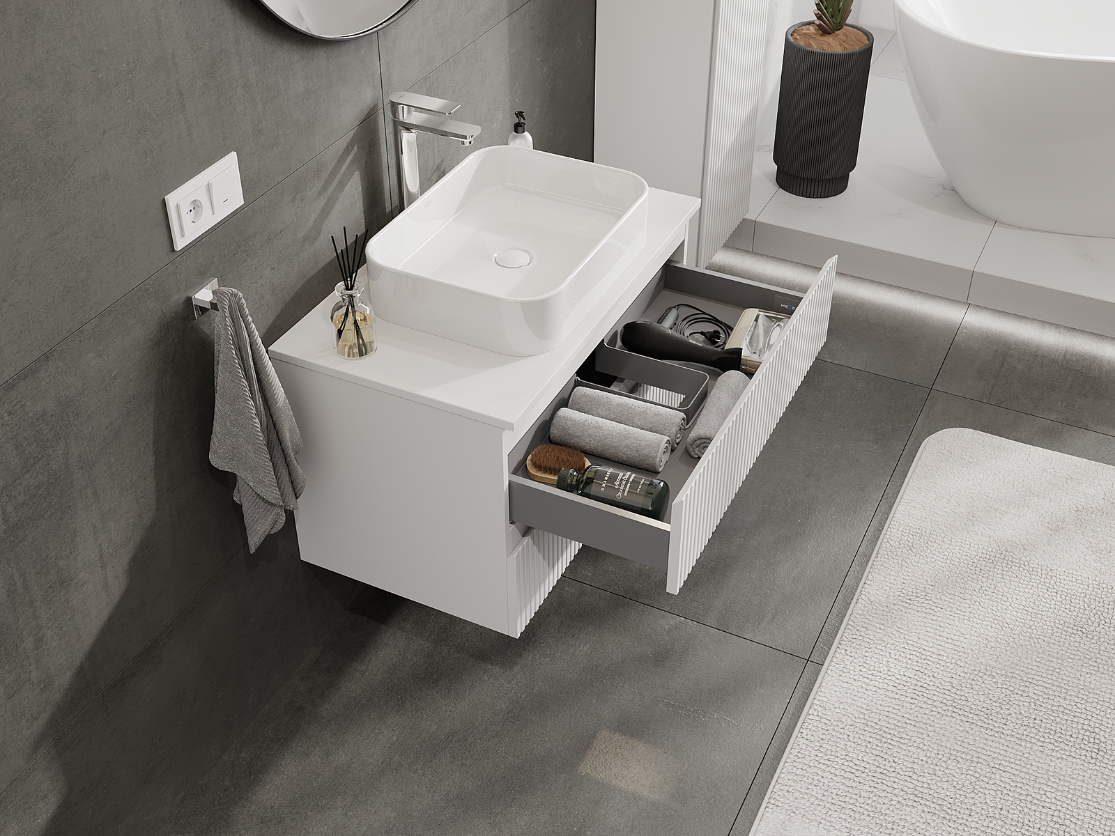 Der Ausschnitt in der Schublade ist so gestaltet, dass er den Siphon aufnehmen kann, der für Waschbeckeninstallationen erforderlich ist. Dadurch kann das Möbelstück voll funktionsfähig montiert werden, ohne auf den Platz in der Schublade zugunsten der Installation verzichten zu müssen.