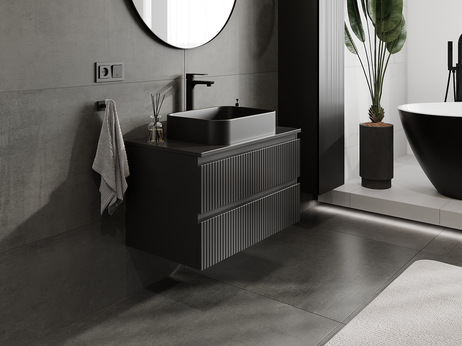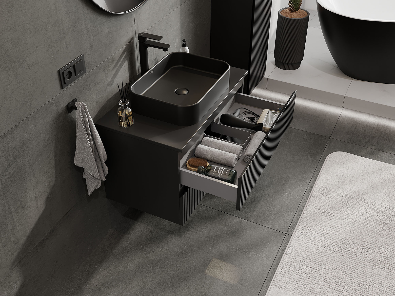 Unsere modularen Badezimmermöbel können in verschiedenen Farbkonfigurationen miteinander kombiniert werden, wodurch eine vollständige Personalisierung ermöglicht wird. Man kann sowohl das Aussehen als auch die Funktionen der einzelnen Elemente auswählen, was es erlaubt, die Möbel an eigene stilistische und funktionale Vorlieben anzupassen.